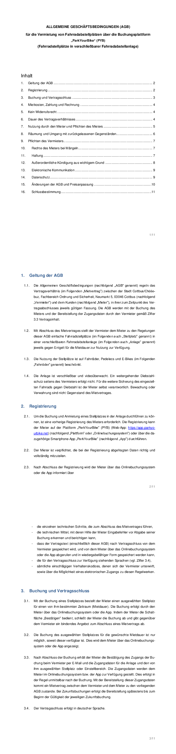 AGB für die Vermietung von Fahrradabstellplätzen über die Buchungsplattform „ParkYourBike“
