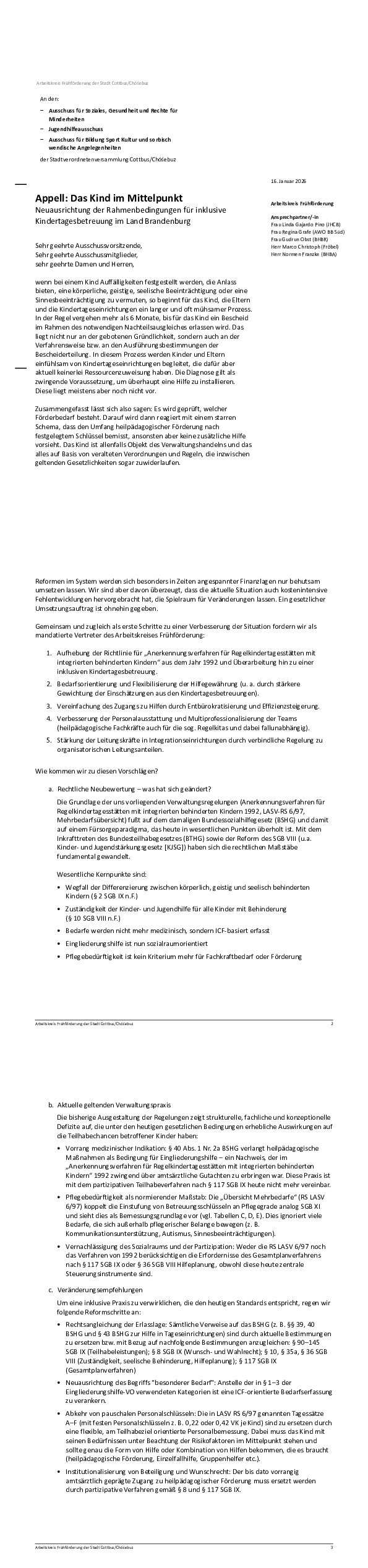 Mit dem Appell wendet sich der Arbeitskreis an die Stadtverordnetenversammlung Cottbus und ihre Fachausschüsse und lädt zu einem fachlichen Dialog ein. Zentrales Anliegen ist es, das Wohl und die Entwicklung der Kinder in den Mittelpunkt des Verwaltungshandelns zu stellen.