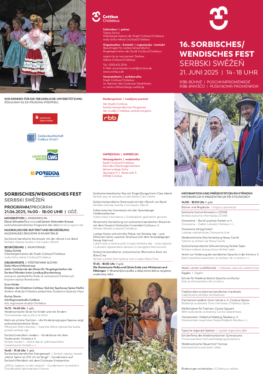 Das sorbische/wendische Fest in Cottbus/Chóśebuz würdigt die die Kultur und Traditionen der sorbischen/wendischen Gemeinschaft. Es findet seit 16 Jahren regelmäßig im Rahmen des Stadtfestes statt und bietet eine bunte Mischung aus Musik, Tanz, Trachten und kulinarischen Spezialitäten. Das Fest ist eine tolle Gelegenheit, die einzigartige Sprache und Bräuche der Sorben/Wenden zu erleben und die kulturelle Vielfalt der Lausitz zu feiern.