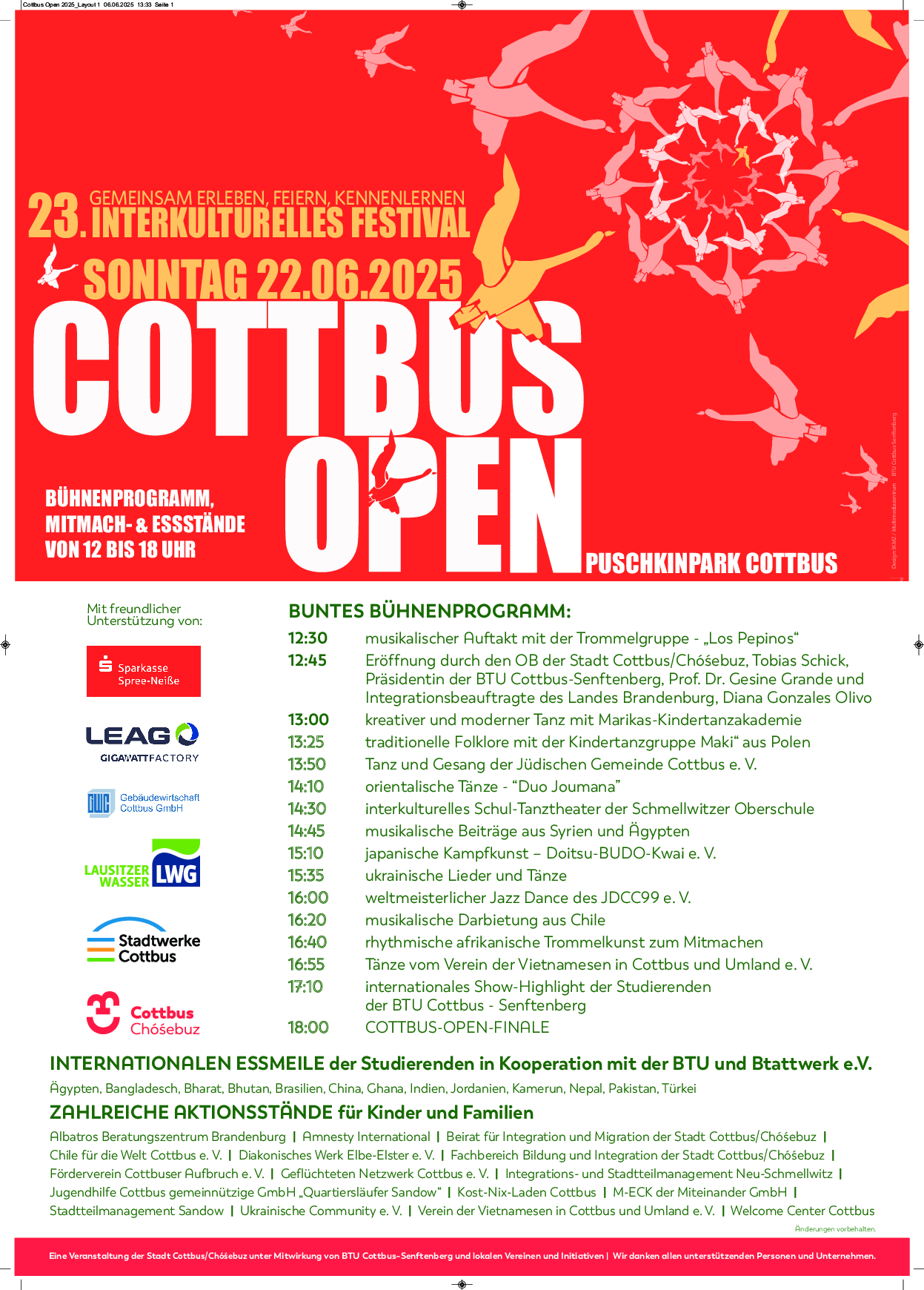 „COTTBUS OPEN“ steht sinnbildlich für unsere Einladung an die Welt, unsere Stadt kennenzulernen, hier heimisch zu werden, zu lernen, zu forschen, zu arbeiten, aber auch das Leben zu genießen, Freude zu haben und Freunde fürs Leben zu finden. Ein idealer Anlass ist unser interkulturelles Festival „COTTBUS OPEN“ am 22. Juni 2025 im Rahmen des 32. Cottbuser Stadtfestes. Weltoffenheit fördern, Mut machen, Vorurteile überwinden, andere Kulturen verstehen – das sind Anliegen, die uns allen am Herzen liegen. Zusammen mit der BTU und einer Vielzahl von Institutionen, Trägern und regionalen Unterstützern, unterbreiten wir allen Bürgerinnen und Bürgern sowie Gästen unserer Stadt ein Angebot zum Kennenlernen, Begegnen und Erleben. Neben einem bunten Bühnenprogramm locken auch kulinarische Highlights aus ver-schiedenen Ländern die Besuchenden weit über die Stadtgrenzen hinaus an. „COTTBUS OPEN“ steht für Vielfalt und Diversity, vollkommen unabhängig der ethnischen Herkunft, der Religion oder Weltanschauung.