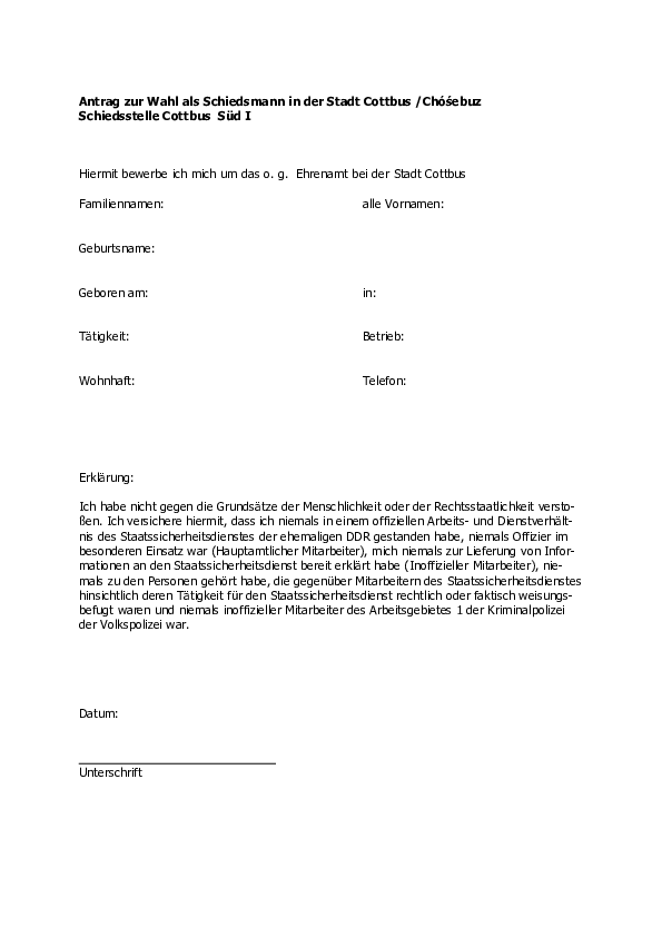 Bewerbungen werden bei der Stadtverwaltung Cottbus/Chóśebuz, Rechtsamt, Neumarkt 5, 03046 Cottbus entgegengenommen.