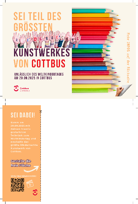 Ein besonderer Höhepunkt wird ein gemeinsames Kunstwerk zum Thema Kinderrechte sein. Kinder können ihre eigenen Postkarten gestalten, die dann Teil des größten Cottbuser Kinderrechtekunstwerks werden.