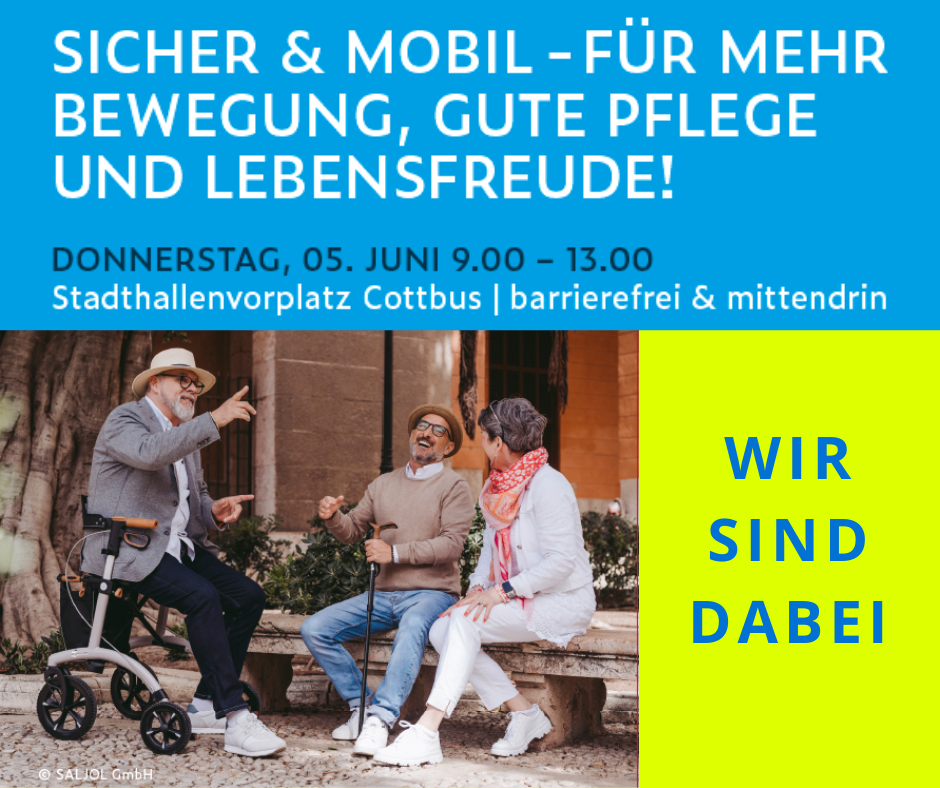 Das Sanitätshaus Zimmermann, der Pflegestützpunkt Cottbus und viele weitere Akteure laden Seniorinnen und Senioren zum Aktionstag „Sicher & Mobil – Für mehr Bewegung, Gute Pflege und Lebensfreude“ ein. Er findet am Donnerstag, 05.06.2025, von 9:00 bis 13:00 Uhr auf dem Stadthallenvorplatz statt. Interessierte erwarten an diesem Vormittag viele hilfreiche Informationen und kleine Erlebnisse rund um die Gesundheit, Mobilität und Lebensfreude.
