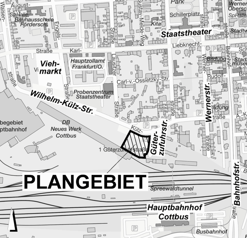 Das Plangebiet schließt sich an das südlich und westlich bestehende Betriebsgelände des neuen Bahnwerkes Cottbus sowie an den zugehörigen Werksparkplatz an und wird im Norden durch die „Wilhelm-Külz-Straße“ und im Osten durch die „Güterzufuhrstraße“ begrenzt.