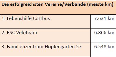 Dank der Sparkasse Spree-Neiße, den Stadtwerken Cottbus, von LWG, GWC, LEAG, Knappschaft Bahn See, dem Brandenburgischen Landesmuseum für moderne Kunst, der Lagune, dem Tierpark, der Parkeisenbahn, dem Piccolo Theater, dem Jump Up Trampolinpark, der Boulderhalle Klunker, der Feuerwehr Cottbus, dem FC Energie Cottbus, der COEX, dem Stadtmuseum, dem Staatstheater, von CMT, ADFC, Radsportclub Cottbus (RSC) sowie dem Stadtmarketingverband standen eine Vielzahl attraktiver Preise für die Radlerinnen und Radler zur Verfügung.