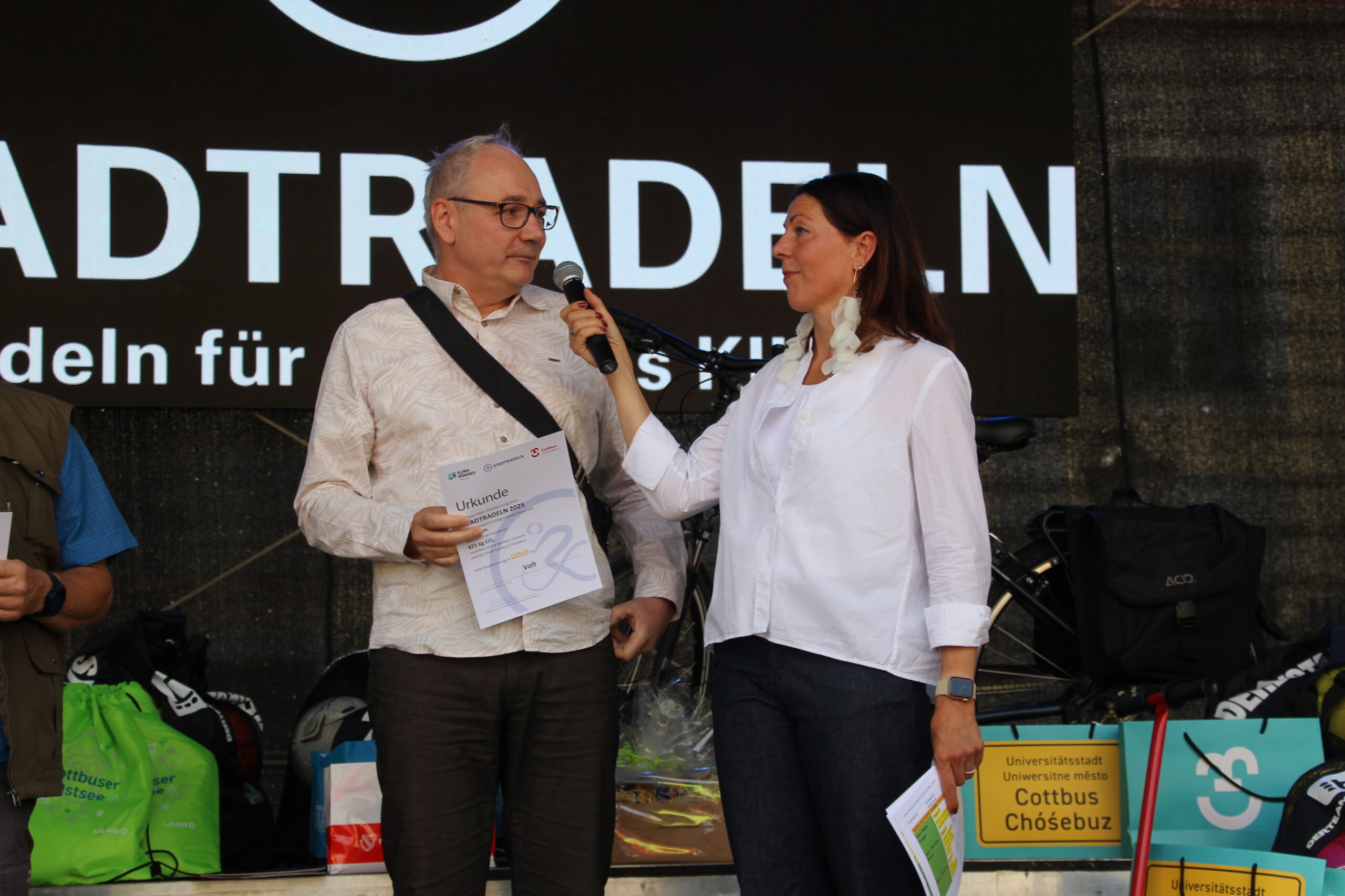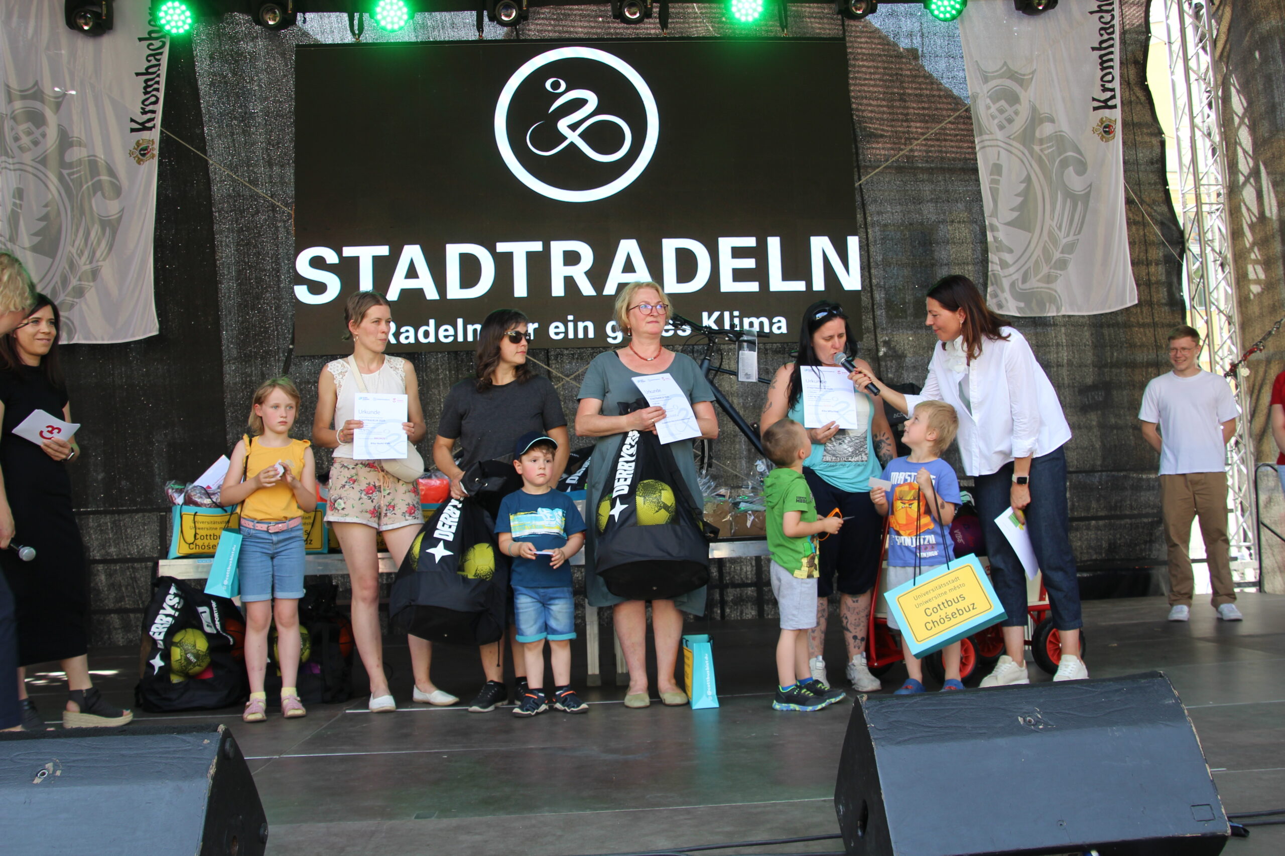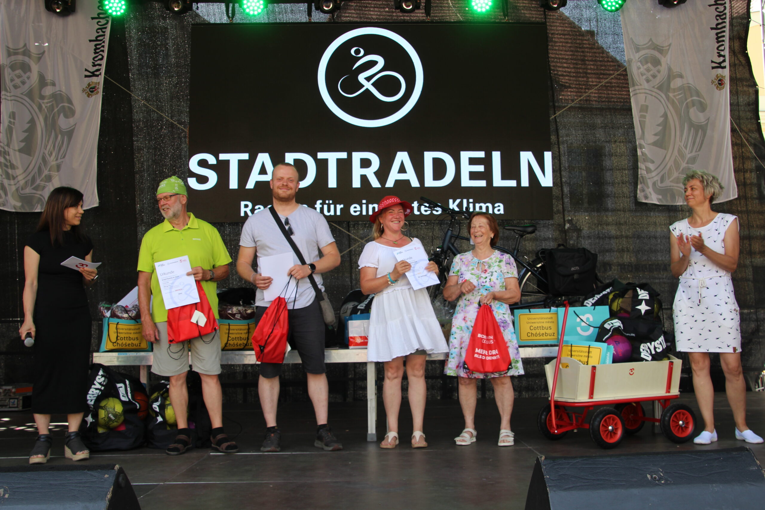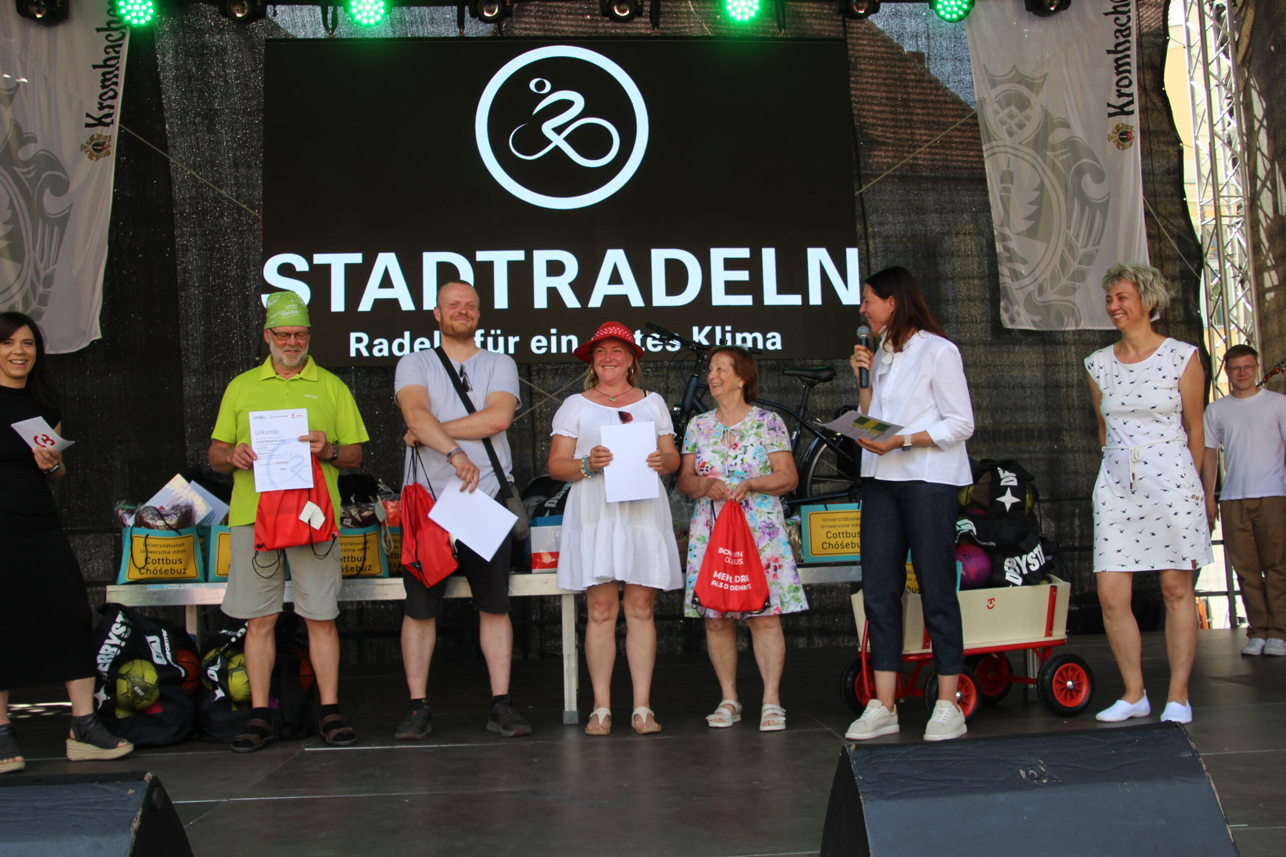 Am Sonntag, 22.06.2025, sind die erfolgreichsten Teams und Radelnde sowie die glücklichen Losgewinner im Rahmen einer feierlichen Preisverleihung auf dem Cottbuser Stadtfest auf der Bühne am Altmarkt von Bürgermeisterin Doreen Mohaupt ausgezeichnet worden.