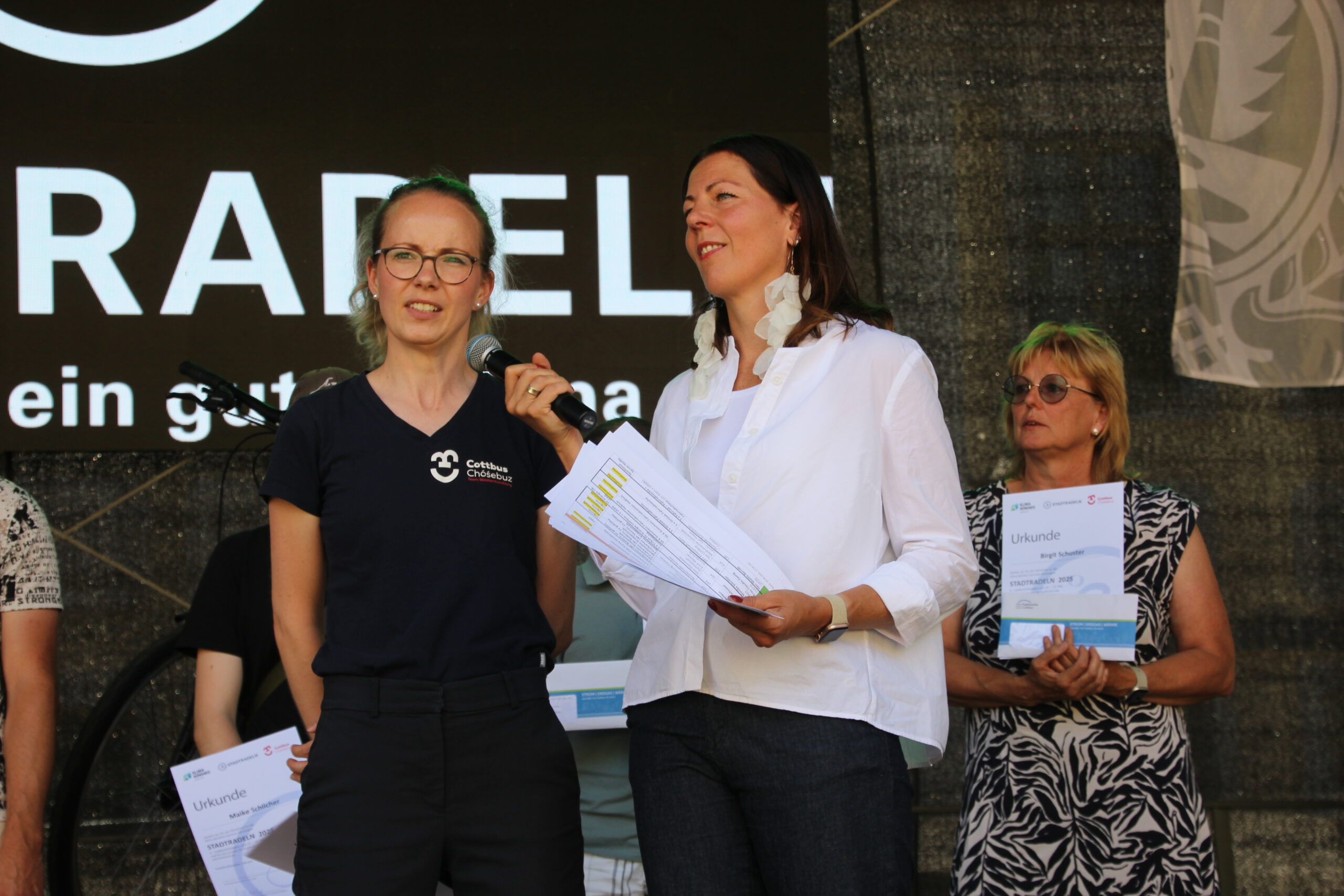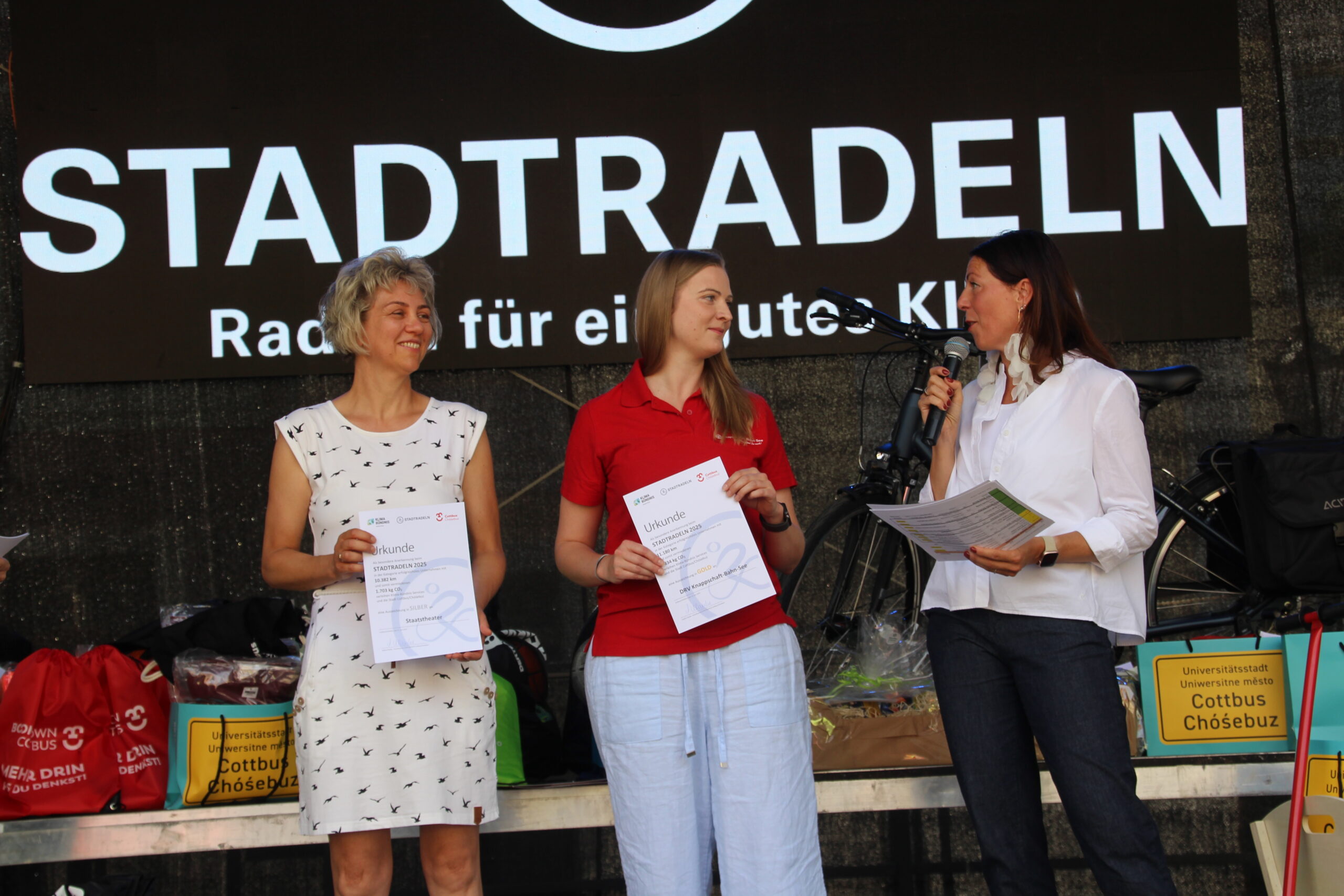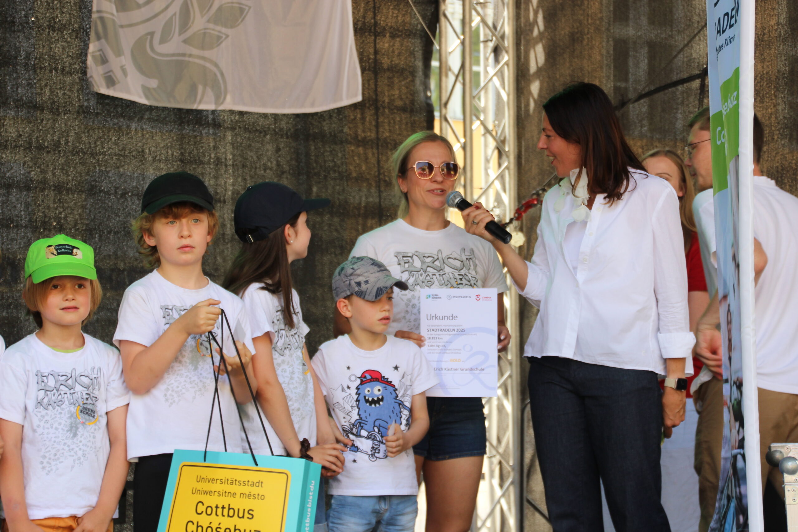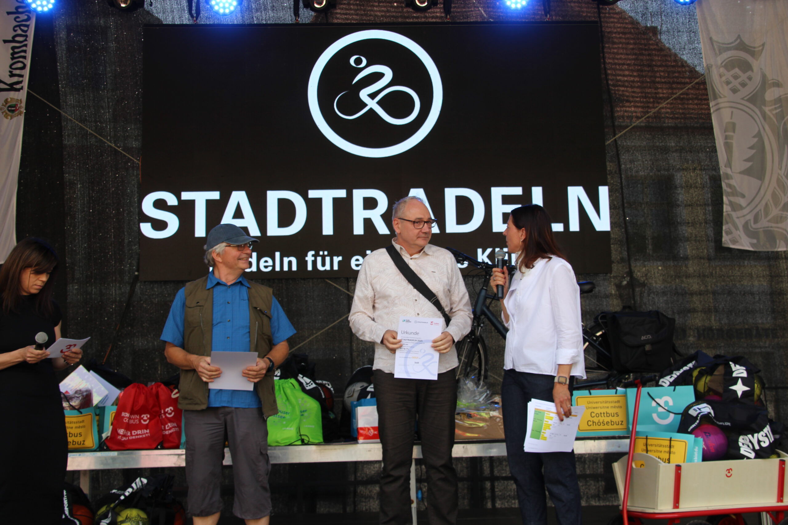 Am Sonntag, 22.06.2025, sind die erfolgreichsten Teams und Radelnde sowie die glücklichen Losgewinner im Rahmen einer feierlichen Preisverleihung auf dem Cottbuser Stadtfest auf der Bühne am Altmarkt von Bürgermeisterin Doreen Mohaupt ausgezeichnet worden.