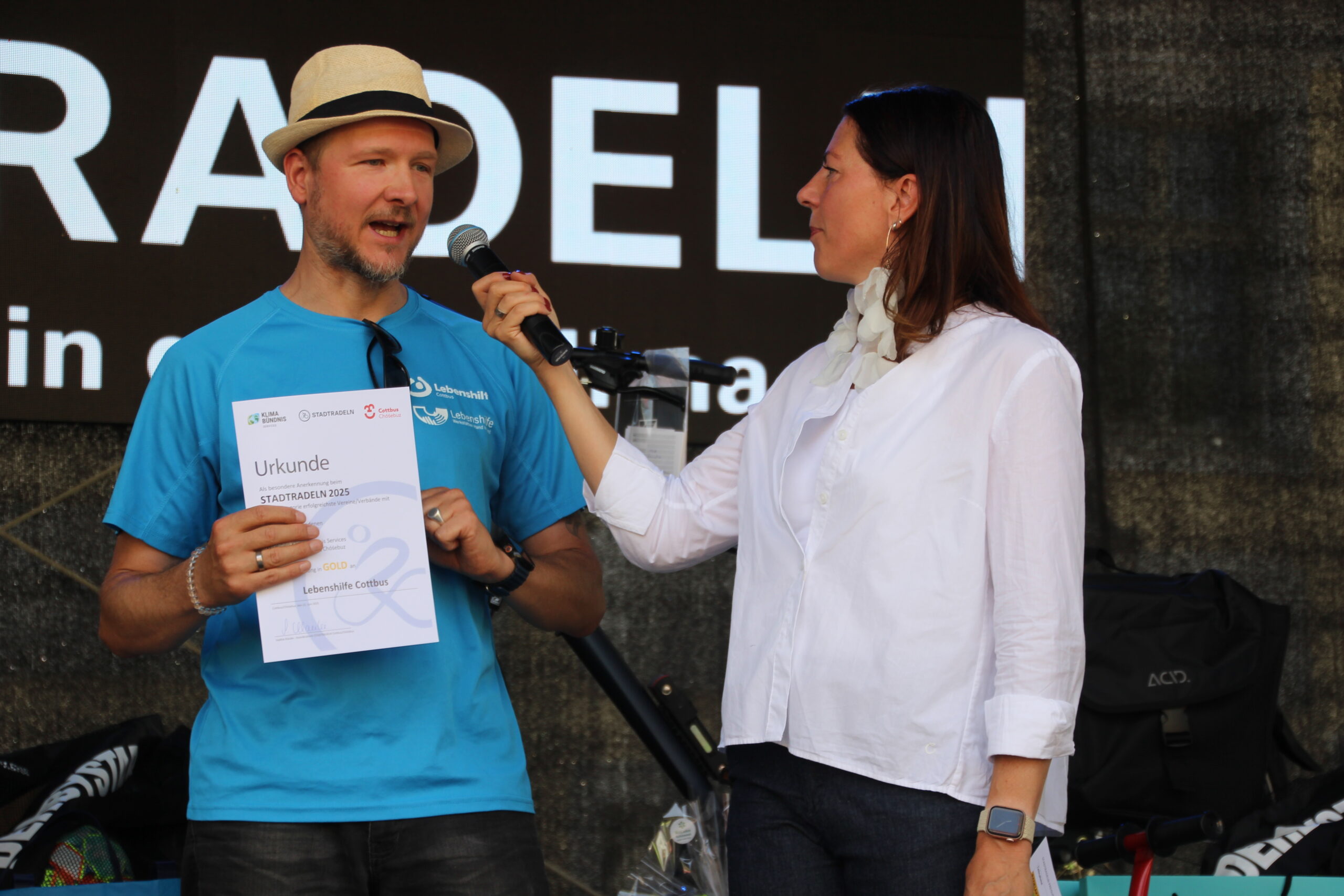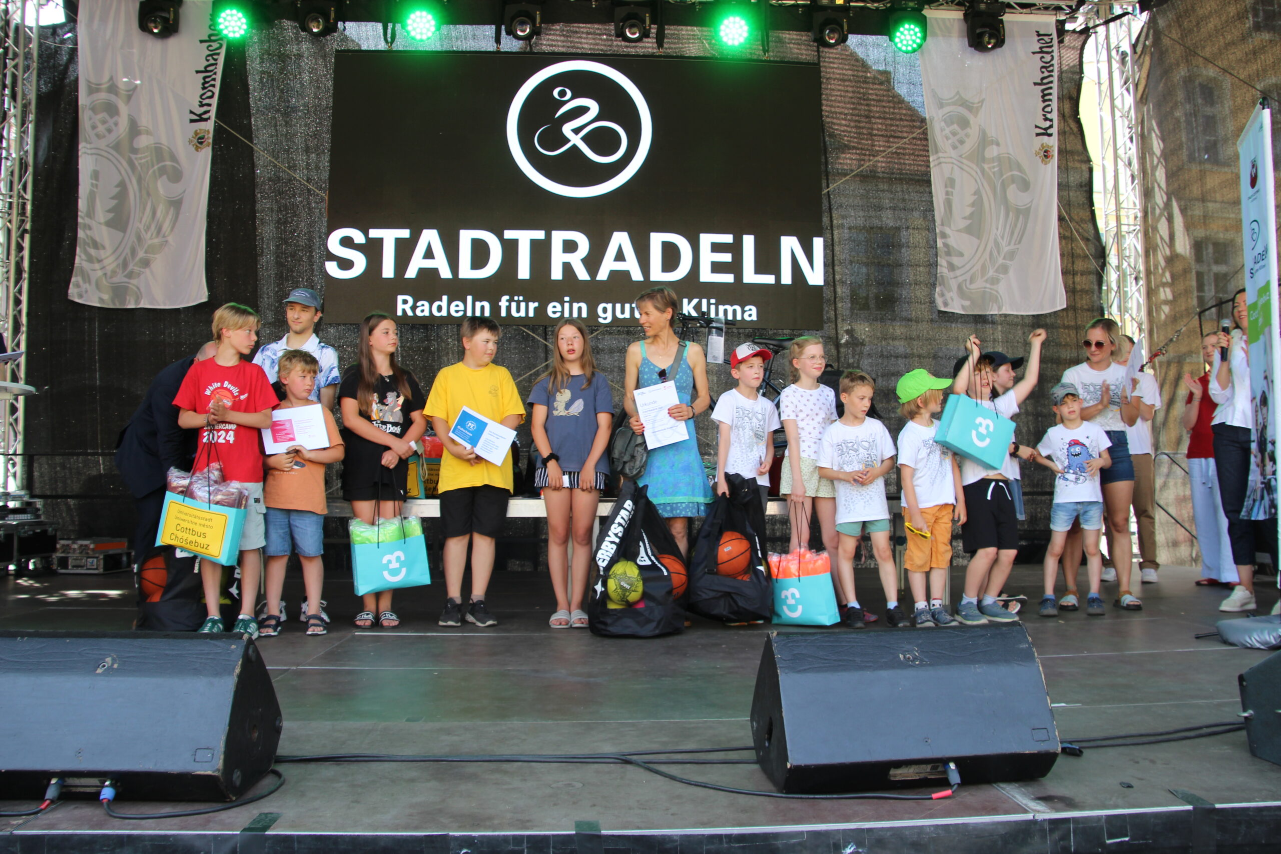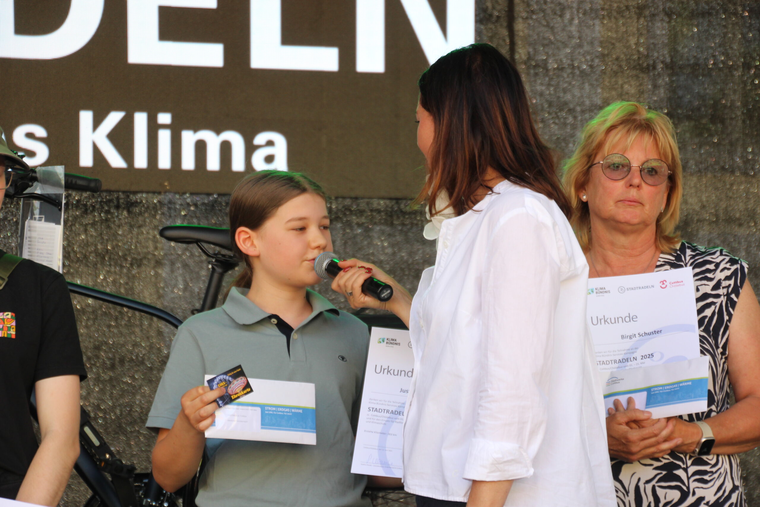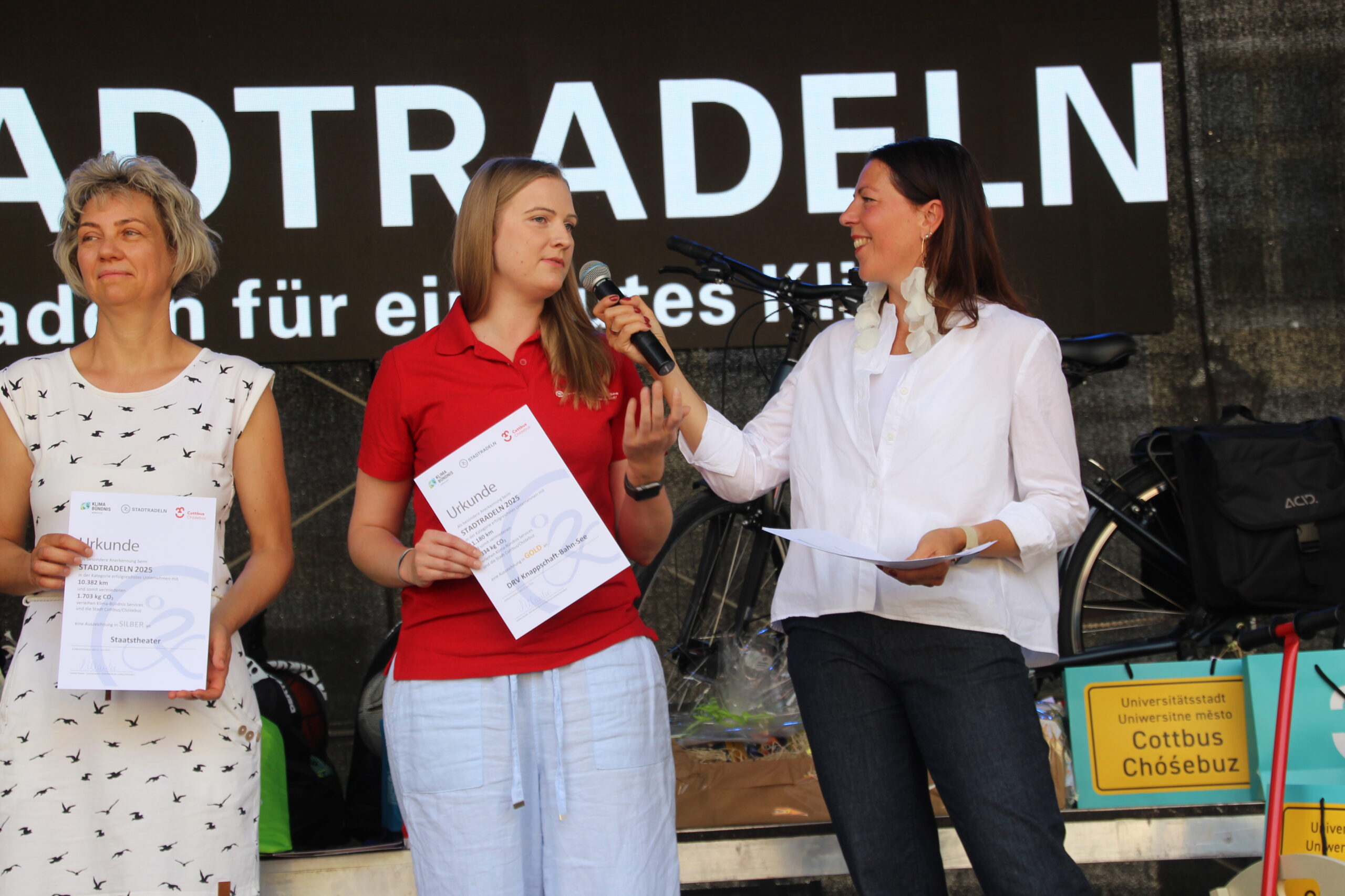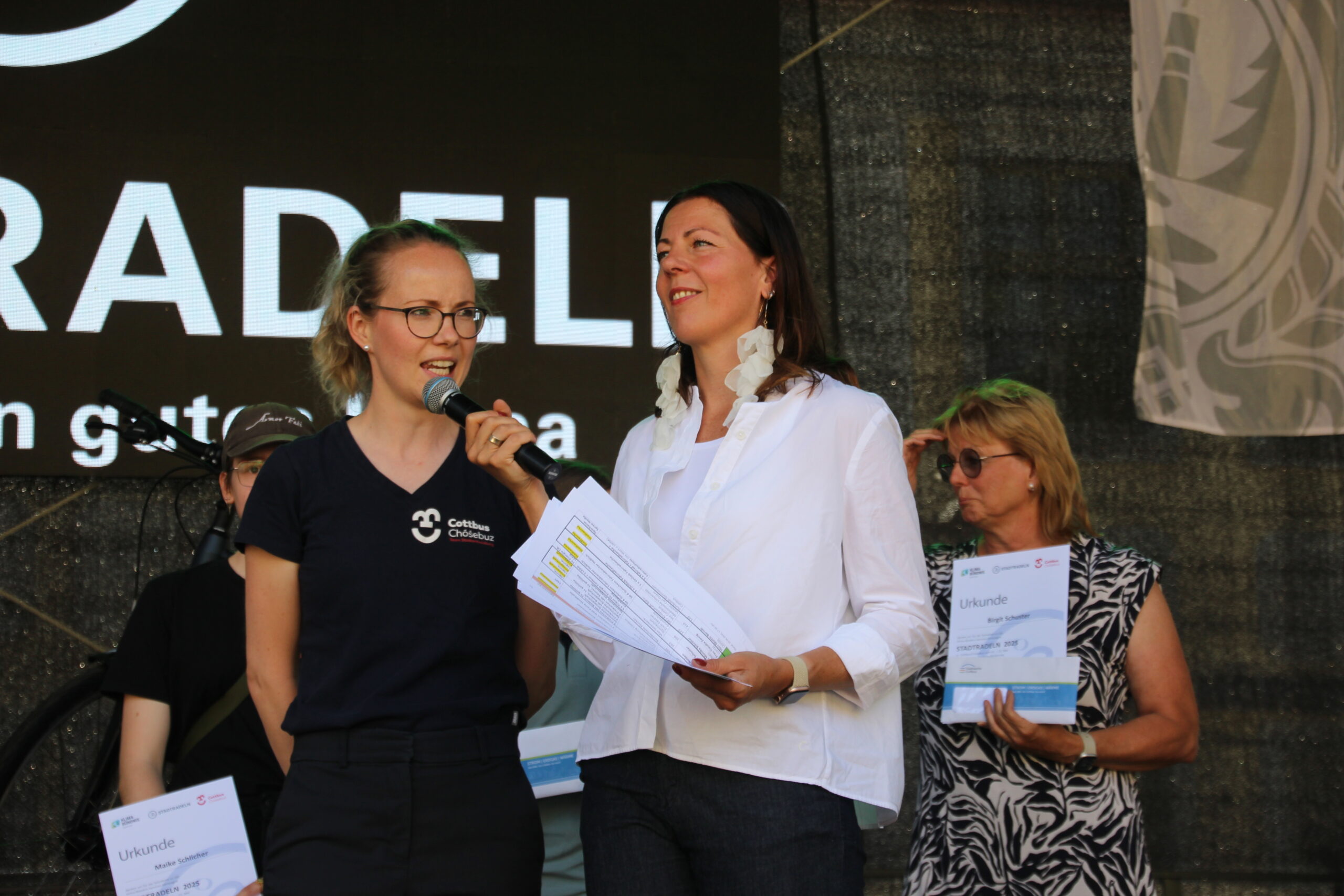 Am Sonntag, 22.06.2025, sind die erfolgreichsten Teams und Radelnde sowie die glücklichen Losgewinner im Rahmen einer feierlichen Preisverleihung auf dem Cottbuser Stadtfest auf der Bühne am Altmarkt von Bürgermeisterin Doreen Mohaupt ausgezeichnet worden.