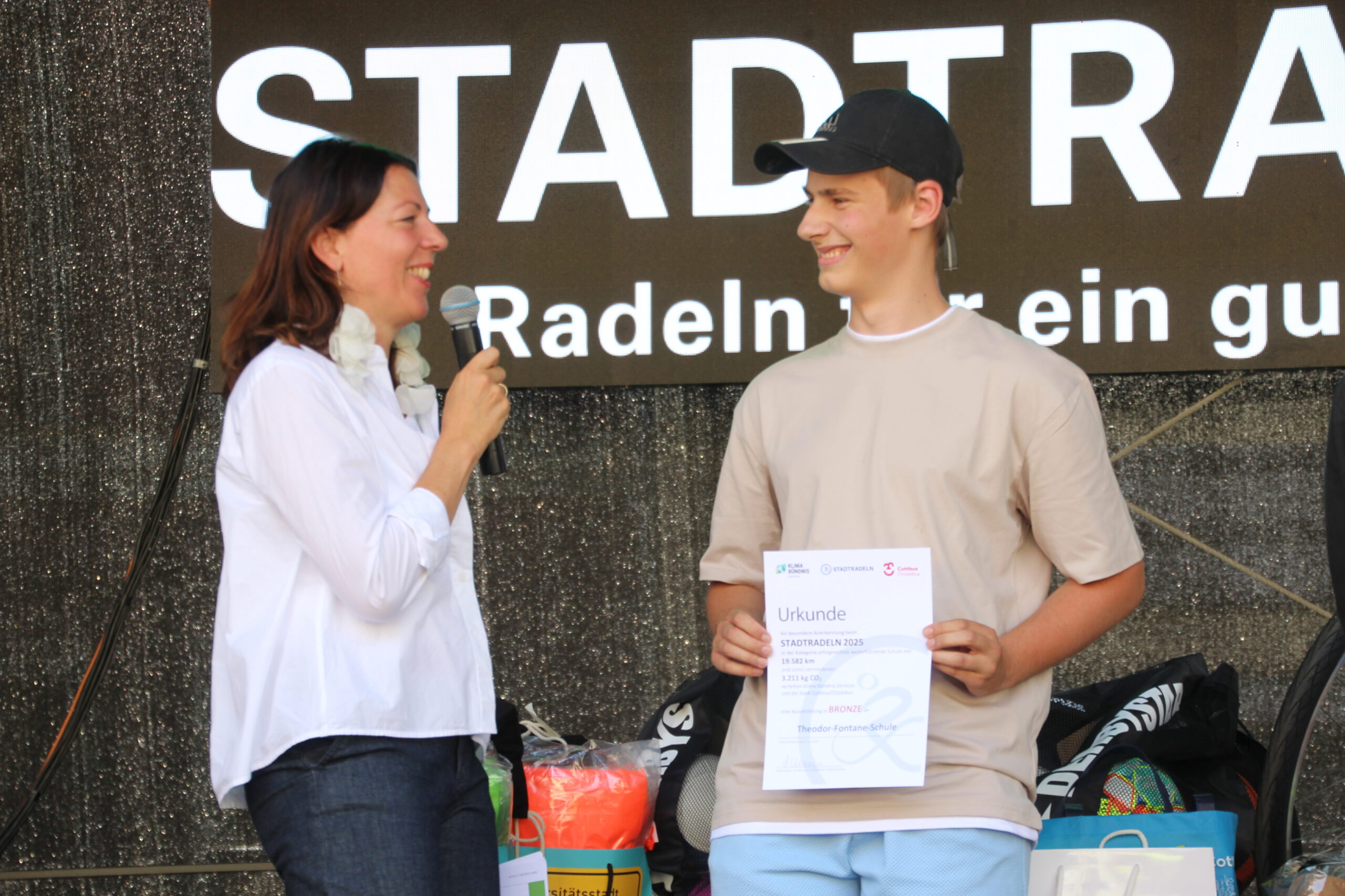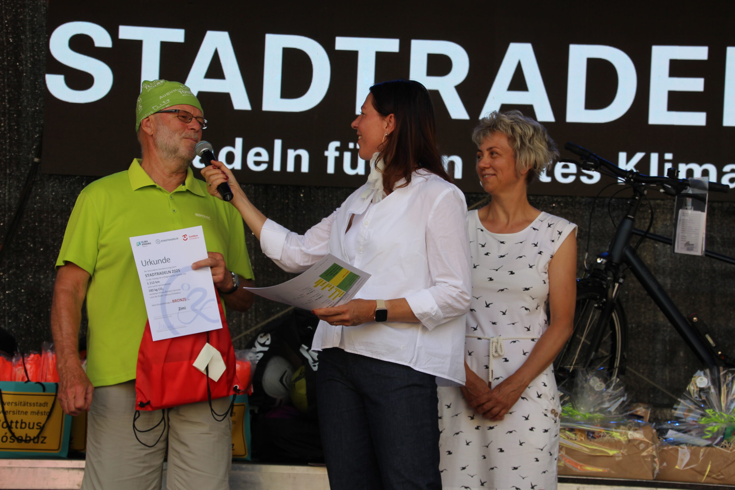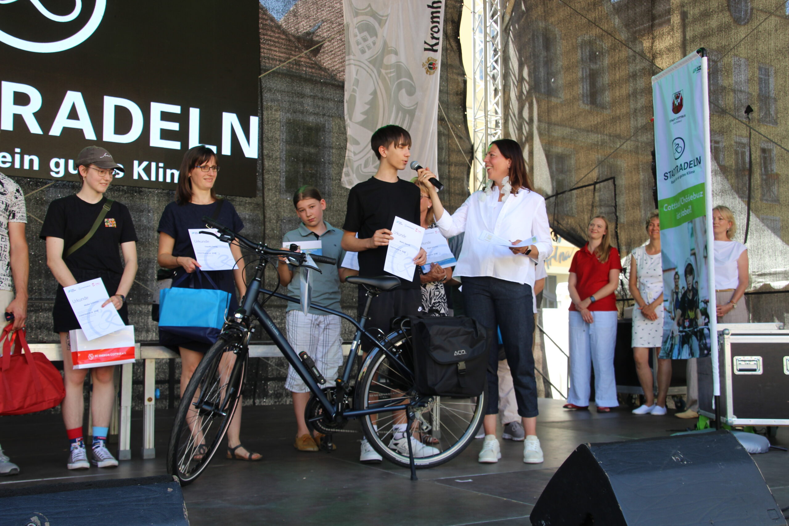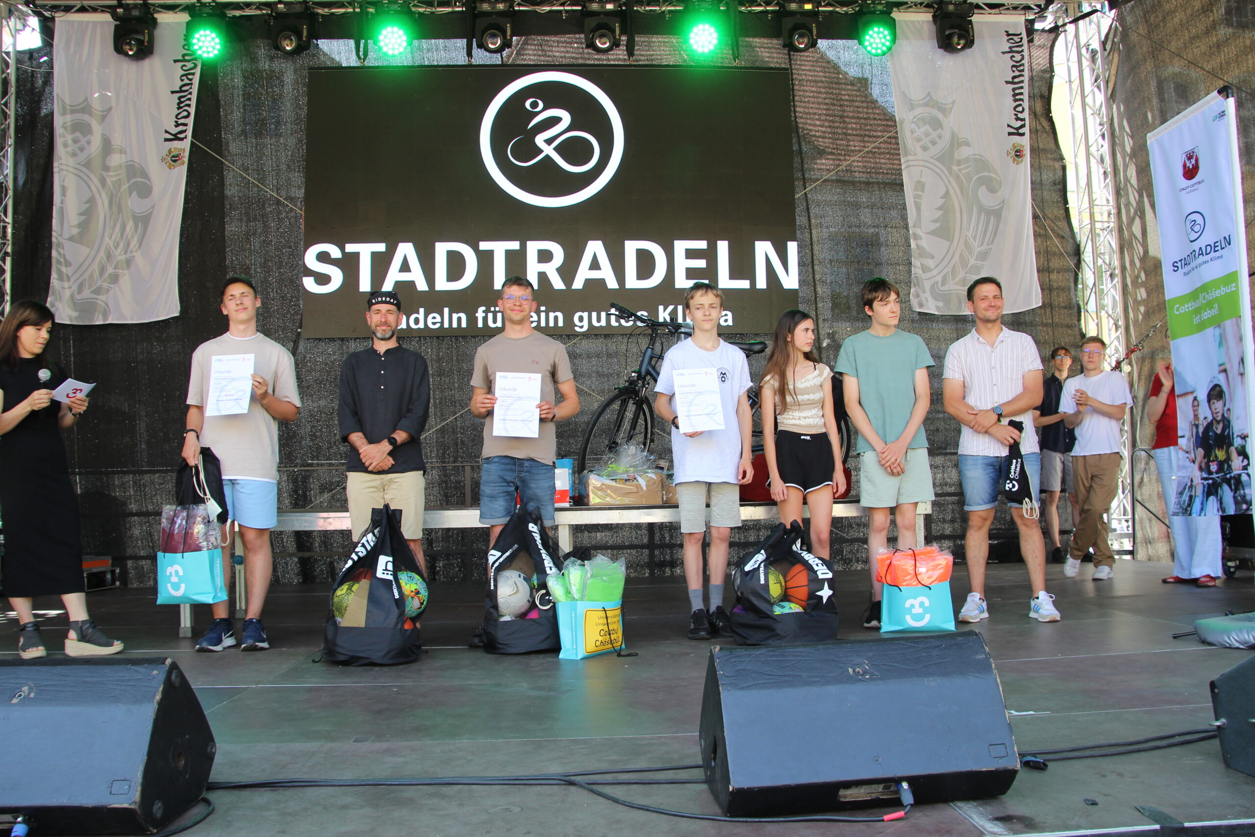 Am Sonntag, 22.06.2025, sind die erfolgreichsten Teams und Radelnde sowie die glücklichen Losgewinner im Rahmen einer feierlichen Preisverleihung auf dem Cottbuser Stadtfest auf der Bühne am Altmarkt von Bürgermeisterin Doreen Mohaupt ausgezeichnet worden.