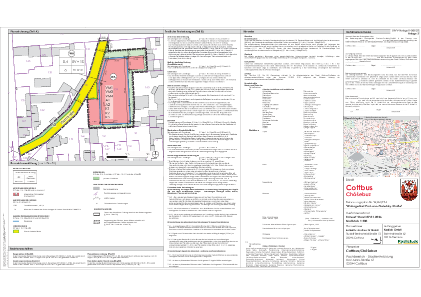 Die Stadtverordnetenversammlung der Stadt Cottbus/Chóśebuz hat in ihrer Sitzung am 25.02.2026 den Entwurf des Bebauungsplanes Nr. W/44/134 „Wohngebiet Carl-von-Ossietzky-Straße“ in der Fassung vom 07.01.2026 einschließlich der zugehörigen Begründung gebilligt und die Beteiligung der Öffentlichkeit gemäß § 3 Abs. 2 Baugesetzbuch (BauGB) beschlossen.
