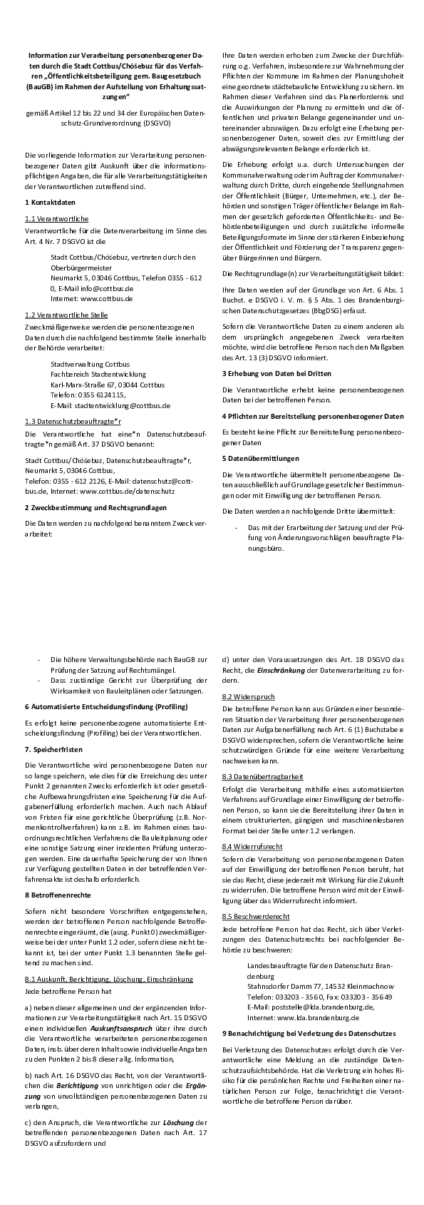 Die Verarbeitung personenbezogener Daten erfolgt auf Grundlage des BauGB in Verbindung mit Art. 6 Abs. 1 Buchst. e Datenschutz-Grundverordnung (DSGVO) und dem Brandenburgischen Datenschutzgesetz (BbgDSG).
