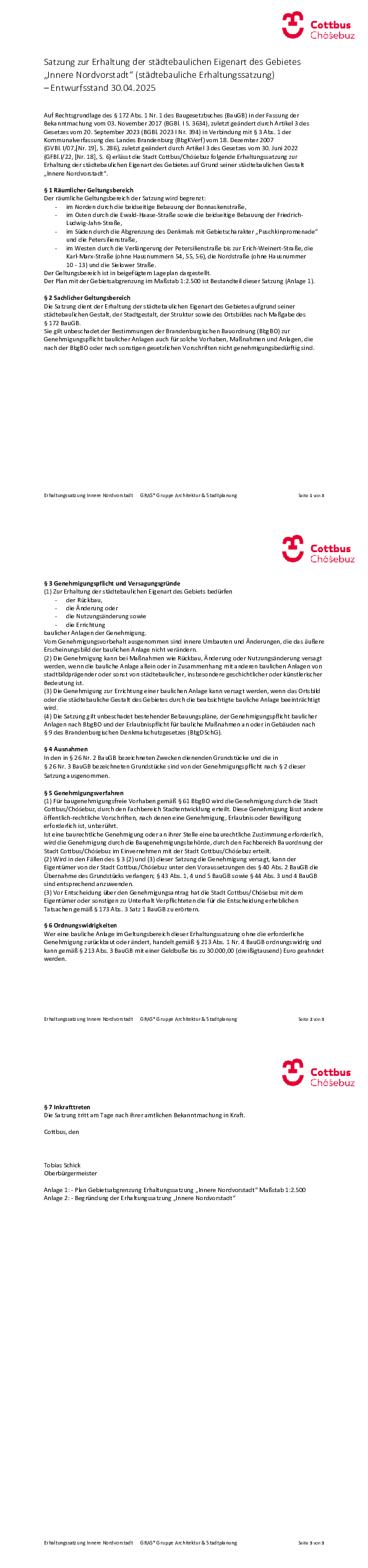 Die Beteiligung der Öffentlichkeit zum Entwurf der Erhaltungssatzung in der Fassung vom 30.04.2025 erfolgt durch die Einstellung der Unterlagen ins Internet im Zeitraum vom 19.05.2025 bis 19.06.2025 auf der Seite cottbus.de/bauplanung.