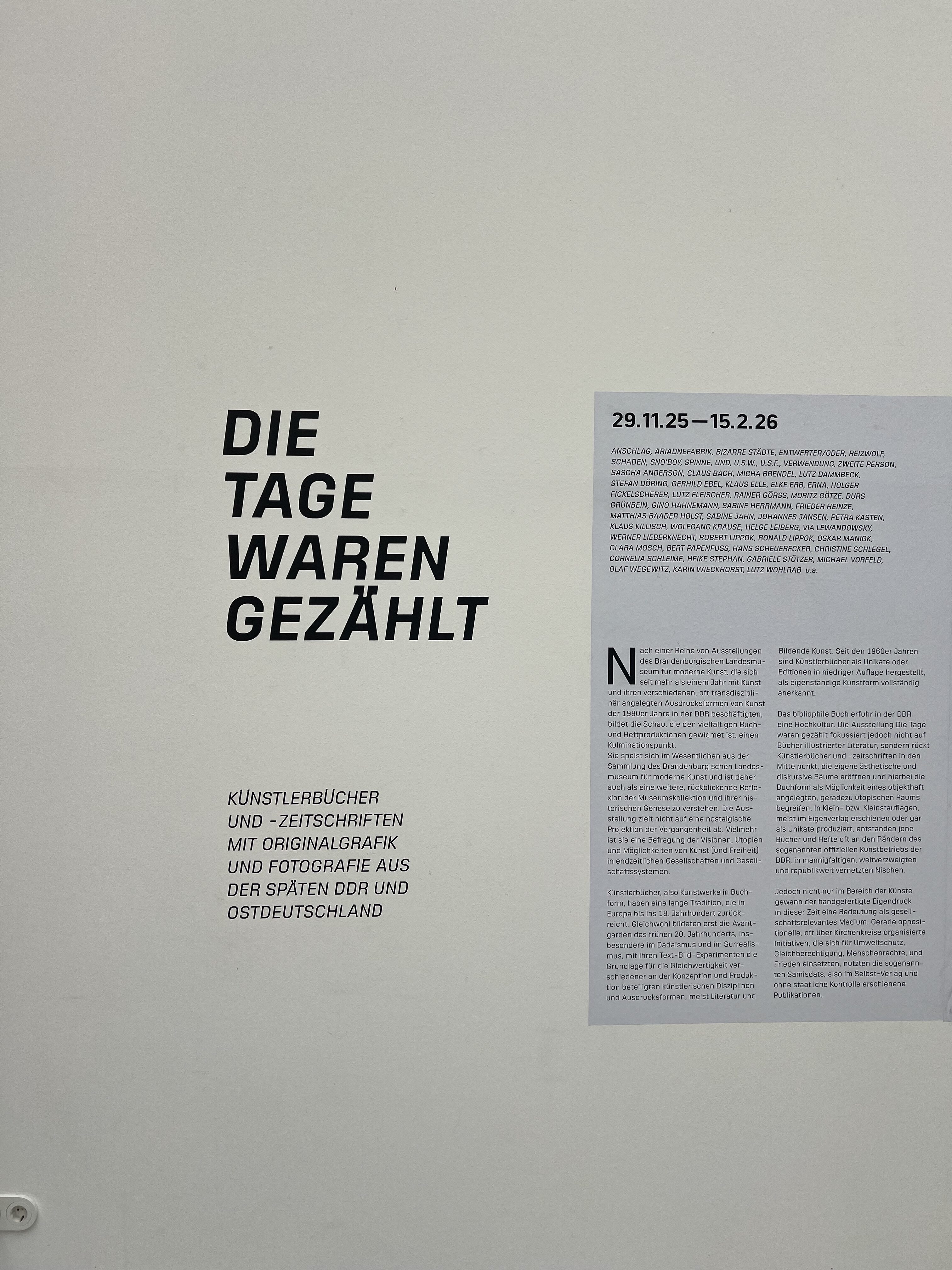 Mit der Ausstellung „Die Tage waren gezählt“ präsentiert das Brandenburgische Landesmuseum für moderne Kunst (BLMK) rund 300 Künstlerbücher und -zeitschriften aus dem Zeitraum von etwa 1980 bis 1995. Die Schau eröffnet einen eindrucksvollen Einblick in ein künstlerisches Feld, das im Spannungsraum zwischen individueller Ausdruckskraft und kollektiver Praxis der späten DDR und den Nachwendejahren entstand. Die begleitende Publikation ist die erste umfassende ihrer Art zu dem Thema und stellt erstmalig internationale wissenschaftliche Perspektiven zur nichtinstitutionellen Kunst- und Literaturproduktion der späten DDR in den Kontext der Kunstgeschichte. Im Fokus der Publikation (und der Ausstellung) stehen reale oder symbolische Formen von Büchern als autonome, in sich geschlossen angelegte Projekte, denen der Charakter portabler, distribuierbarer, individuell sowie kollektiv rezipierbarer „Ausstellungen“ immanent ist. In verschiedenen Kapiteln werden im Rückblick aus heutiger Perspektive sowohl formalästhetische als auch thematische Konzepte und Produktionen vorgestellt.