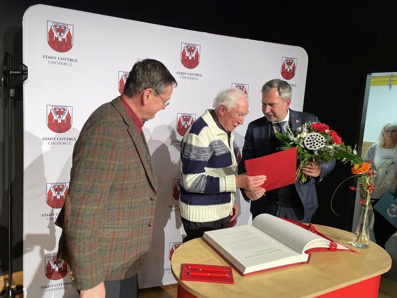 Drei durften sich während der Feier im Saal des Stadthauses in die Ehrenchronik der Stadt Cottbus/Chóśebuz eintragen.