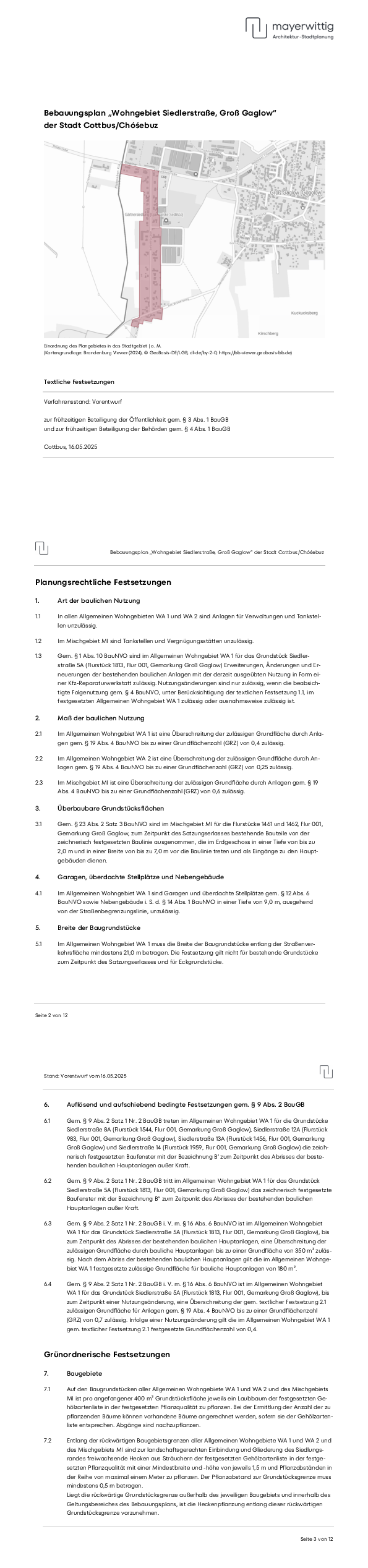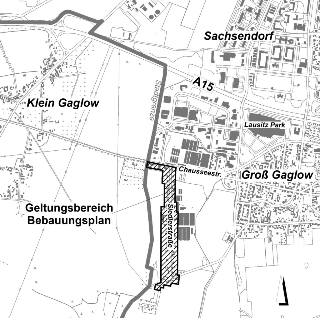 Die Stadtverordnetenversammlung der Stadt Cottbus/Chóśebuz hat am 29.03.2023 in öffentlicher Sitzung gemäß § 1 Abs. 3 Baugesetzbuch (BauGB) die Aufstellung des Bebauungsplanes „Wohngebiet Siedlerstraße, Groß Gaglow“ beschlossen.