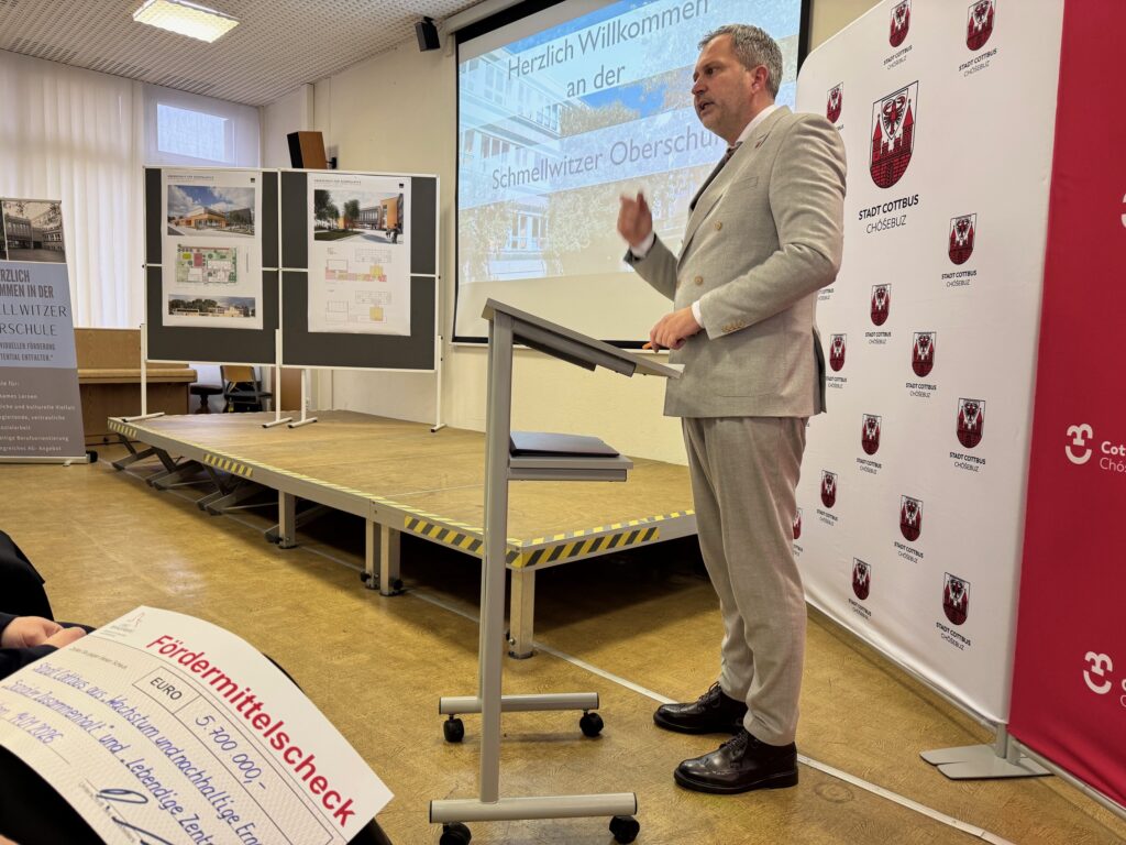 Infrastruktur-Staatssekretärin Ina Bartmann übergab am Mittwoch in der Aula der Schmellwitzer Oberschule einen Scheck in Höhe von 5,7 Millionen Euro an Oberbürgermeister Tobias Schick. Die Mittel stammen von Bund und Land; ergänzt um den städtischen Eigenanteil stehen somit insgesamt 8,3 Millionen Euro zur Verfügung.