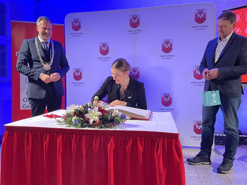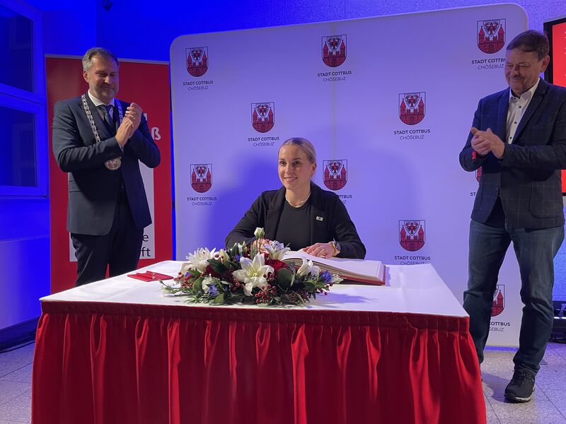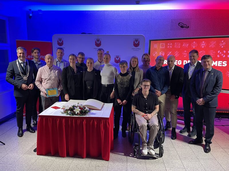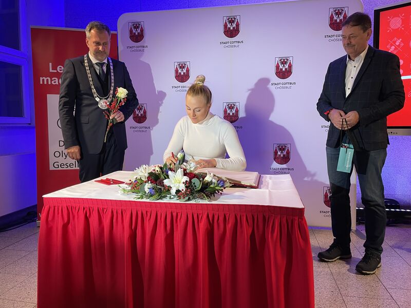 Die olympischen und paralympischen Medaillengewinnerinnen und -gewinner aus Cottbuser Vereinen sind seit Mittwoch, 20.11.2024, erneut mit neuen Plaketten auf dem „Weg des Ruhmes“ in Cottbus/Chóśebuz verewigt. Geehrt wurden damit Para-Schwimmer Josia Topf sowie die Para-Cyclistin Maike Hausberger, die in Paris drei bzw. zwei Medaillen, darunter Gold, holten. Zugleich trugen sich die Radsportlerinnen Lea-Sophie Friedrich, Emma Hinze und Pauline Grabosch, die in Paris Silber und Bronze gewannen, mit den weiteren Teilnehmerinnen und Teilnehmern der Pariser Spiele und den Trainerinnen und Trainern in das Goldene Buch der Stadt Cottbus/Chóśebuz ein.