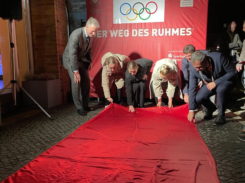 Der „Weg des Ruhmes“ vor dem Rathaus in der Berliner Straße ist von der Deutschen Olympischen Gesellschaft initiiert worden. Insgesamt sind dort jetzt 76 Plaketten für die Medaillengewinnerinnen und -Gewinner bei olympischen und paralympischen Spielen seit 1896 verlegt.