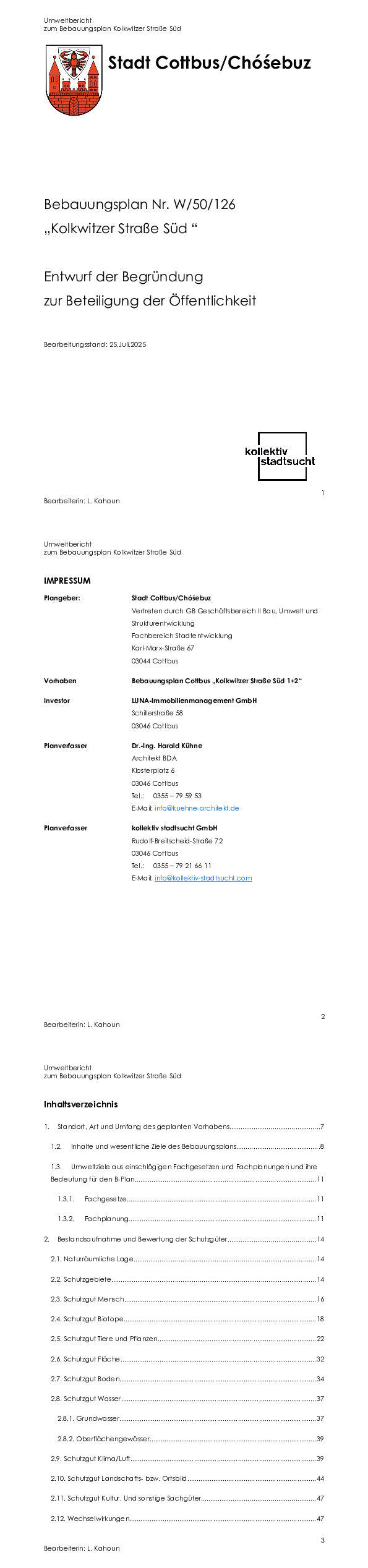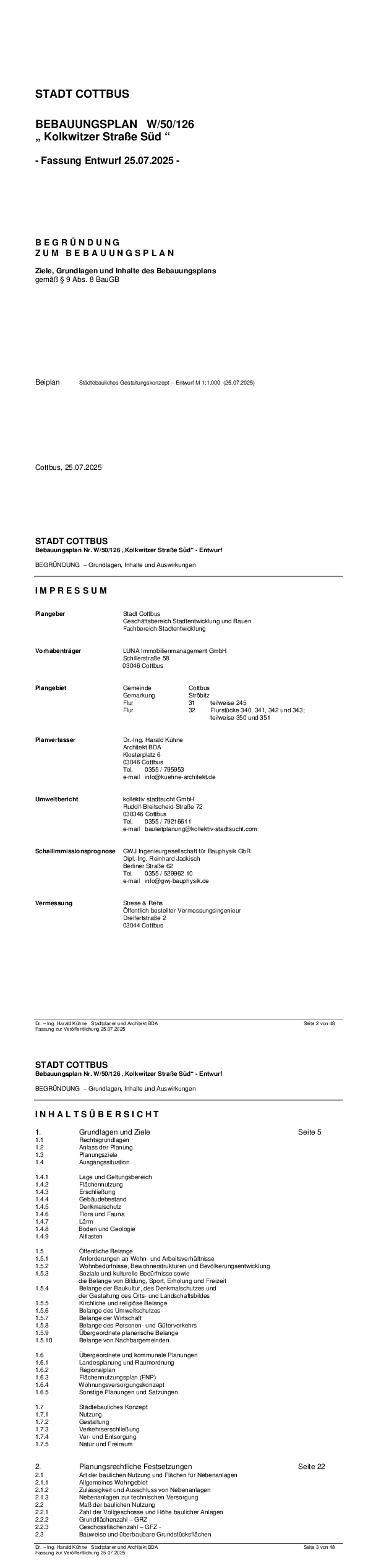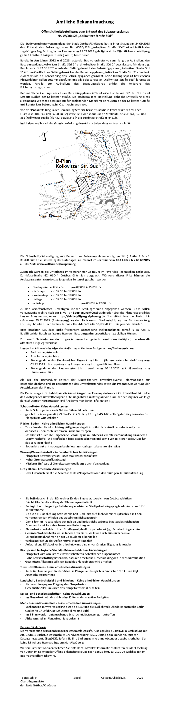 Die Stadtverordnetenversammlung der Stadt Cottbus/Chóśebuz hat in ihrer Sitzung am 24.09.2025 den Entwurf des Bebauungsplanes Nr. W/50/126 „Kolkwitzer Straße Süd“ einschließlich der zugehörigen Begründung in der Fassung vom 25.07.2025 gebilligt und die Öffentlichkeitsbeteiligung gemäß § 3 Abs. 2 Baugesetzbuch (BauGB) beschlossen.