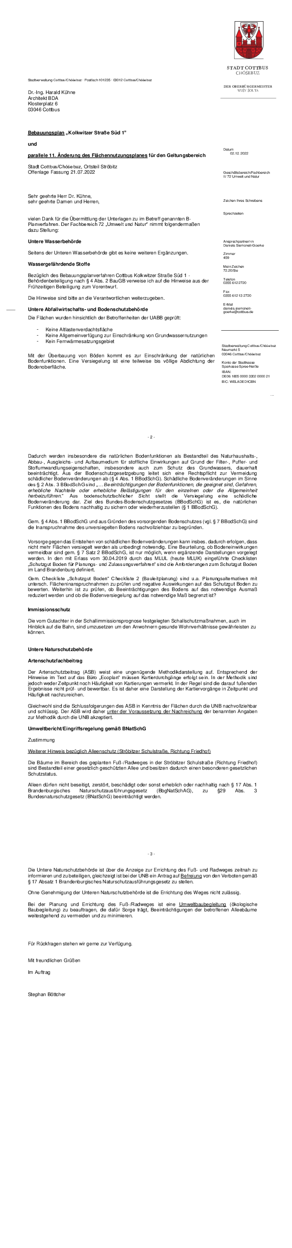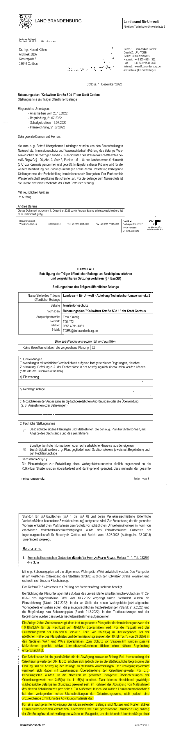 Zu den veröffentlichten Unterlagen können Stellungnahmen abgegeben werden. Diese sollen vorzugsweise elektronisch per E-Mail an Bauplanung@Cottbus.de oder über das Planungsportal des Landes Brandenburg unter https://bb.beteiligung.diplanung.de übermittelt bzw. bei Bedarf bis spätestens 15.12.2025 (Posteingang) an den Fachbereich Stadtentwicklung der Stadtverwaltung Cottbus/Chóśebuz, Technisches Rathaus, Karl-Marx-Straße 67, 03044 Cottbus gesendet werden.