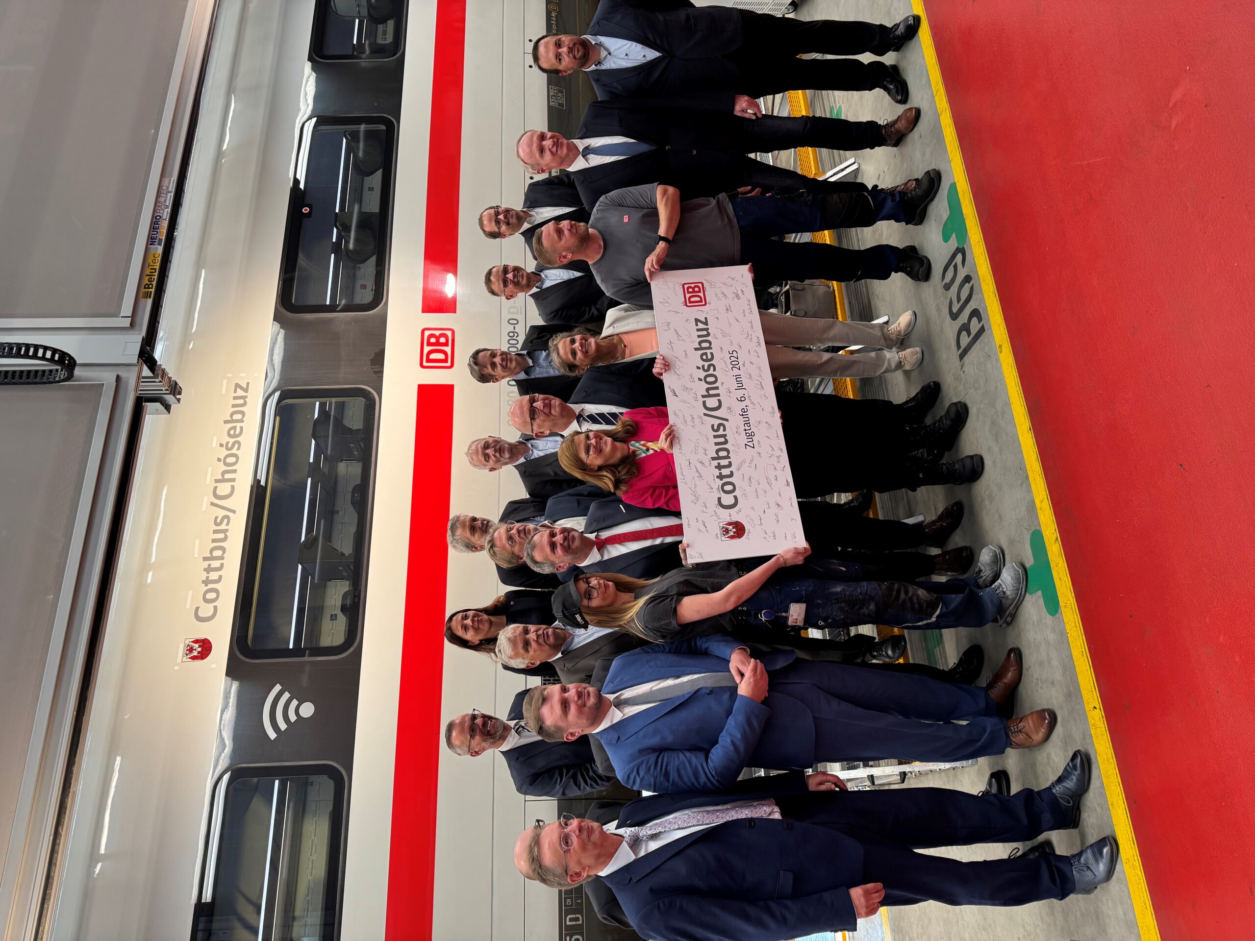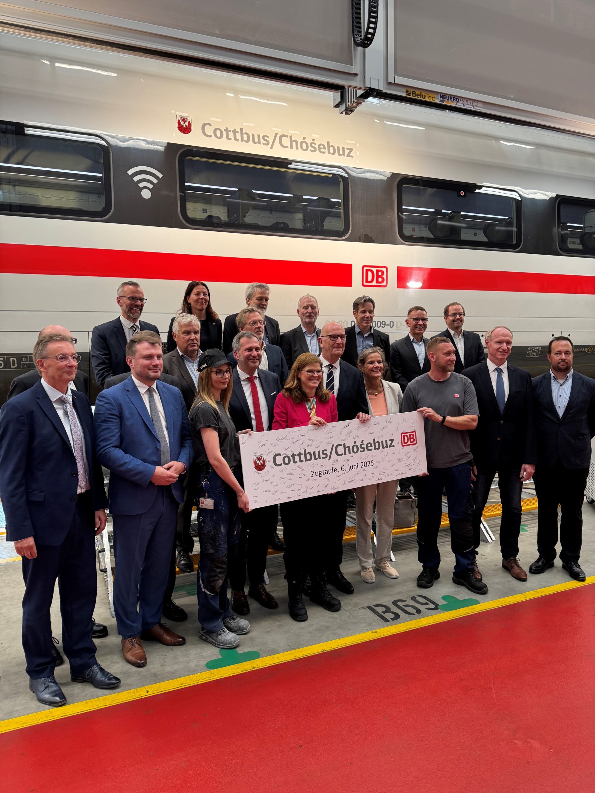 Regionaltypisch mit Spreewälder Gurkenwasser wurde der ICE-Triebzug 9009 im neuen Werk der DB in Cottbus/Chóśebuz getauft. Brandenburgs Ministerpräsident Dr. Dietmar Woidke, der Cottbuser Oberbürgermeister Tobias Schick, Dr. Daniela Gerd tom Markotten, DB-Vorständin für Digitalisierung und Technik, und Angelina Tantow, Fahrzeuglackiererin in Ausbildung im neuen Werk Cottbus, enthüllten gemeinsam das Stadtwappen und Schriftzug „Cottbus / Chóśebuz“. Diese sind jetzt rechts und links an beiden Spitzen des rund 350 Meter langen ICE zu sehen.
