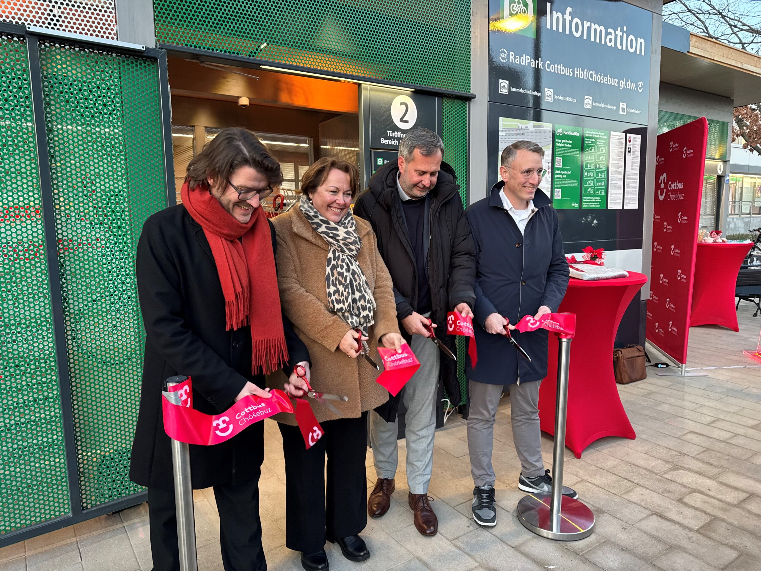 Tobias Schick, Oberbürgermeister von Cottbus/Chóśebuz: „Das Fahrradparkhaus als erstes dieser Angebote in unserer Stadt ist ein Gewinn für Reisende, für den städtischen Verkehr und die Umwelt. Jetzt hoffen wir auf viele zufriedene, aber auch rücksichtsvolle Nutzerinnen und Nutzer. Wir sind dankbar für die umfangreiche Förderung, die ein solches Vorhaben erst möglich machen.“