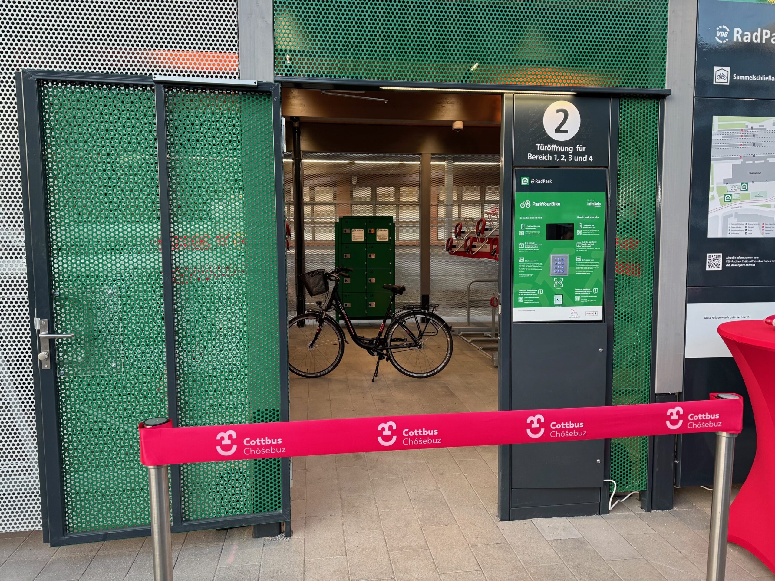 Das neue Fahrradparkhaus an der Südseite des Hauptbahnhofes Cottbus wurde heute feierlich eröffnet. Infrastrukturstaatssekretärin Ina Bartmann nahm gemeinsam mit dem Oberbürgermeister der Stadt Cottbus/Chóśebuz, Tobias Schick, dem Geschäftsführer des VBB, Christoph Heuing sowie Michael Fugel, Geschäftsführer von infraVelo teil. Mit 186 komfortablen Stellplätzen – darunter Sammelschließanlagen, sicheren Abstellmöglichkeiten für Lastenräder und Kinderanhängern und modernen Doppelstockparkern – bietet die Anlage Pendlerinnen und Pendlern ab sofort einen attraktiven Service für den Alltag. Mit dem „VBB-RadPark“ in Cottbus folgt ein weiterer Schritt für die Verknüpfung von ÖPNV und Radverkehr in Brandenburg – weitere Projekte sind bereits im Bau und werden bis Ende 2026 umgesetzt.