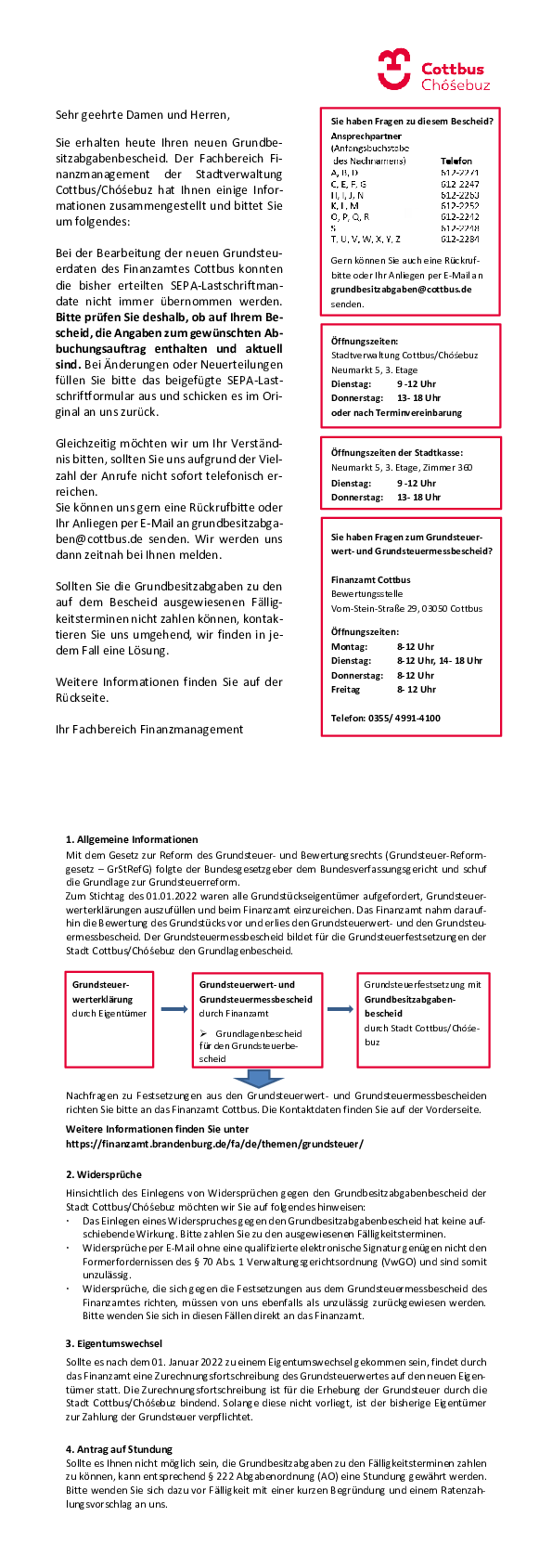 Im Internet hat die Stadt Cottbus/Chóśebuz auf der Startseite von www.cottbus.de eine extra Grundsteuerkachel eingerichtet, unter der alle Ansprechpartner und Kontaktdaten sowie weitere Fragen und Antworten (FAQ) zur Grundsteuerreform veröffentlicht sind.