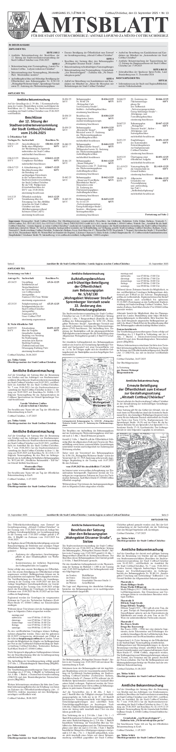 - Amtliche Bekanntmachung der Beschlüsse der 12. Sitzung der Stadtverordnetenversammlung der Stadt Cottbus/Chóśebuz vom 25.06.2025