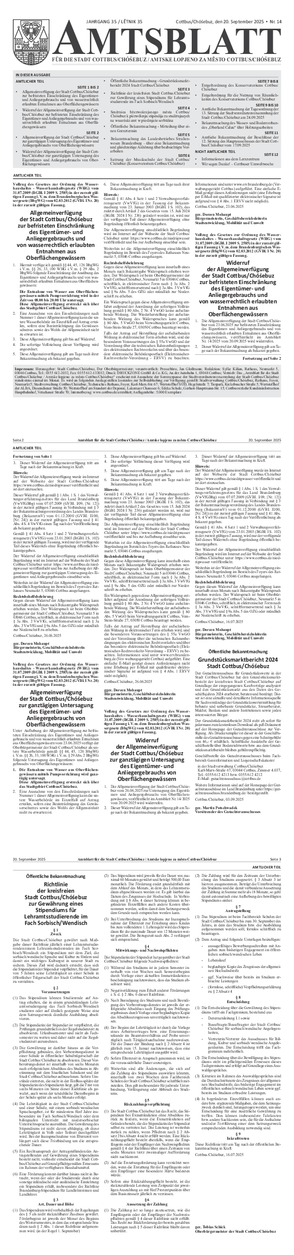 - Widerruf der Allgemeinverfügung der Stadt Cottbus/Chóśebuz zur befristeten Einschränkung des Eigentümer- und Anliegergebrauchs und von wasserrechtlich erlaubten Entnahmen aus Oberflächengewässern