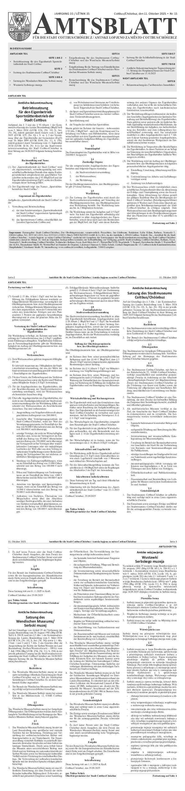 - Amtliche Bekanntmachung der Tagesordnung der 13. Sitzung des Hauptausschusses der Stadt Cottbus/Chóśebuz am 15.10.2025