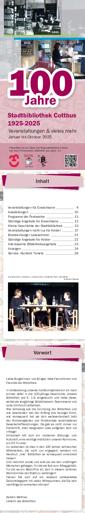 Die städtische Einrichtung Bibliothek steuert munter und voller Tatendrang auf ihren 100. Geburtstag zu. Dazu ist ein Programmheft erschienen. Neben den Informationen zu den Veranstaltungen für alle Altersgruppen gibt es interessante Bibliotheksangebote im Überblick sowie einen Abdruck der kurze Geschichte unserer Einrichtung aus dem Heimatkalender 2025.