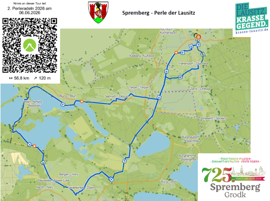 Rauf aufs Rad und gemeinsam die wunderschöne Lausitz entdecken! Start ist auf dem Marktplatz in Spremberg. Von dort führt die rund 56,8 km lange Tour mit etwa 120 Höhenmetern durch die idyllische Umgebung rund um Spremberg, die Perle der Lausitz. Die geführte Tour kann ganz einfach über die Komoot-App begleitet werden. Also anmelden, mitradeln und die Region neu erleben! Jetzt QR-Code scannen, anmelden und dabei sein!
