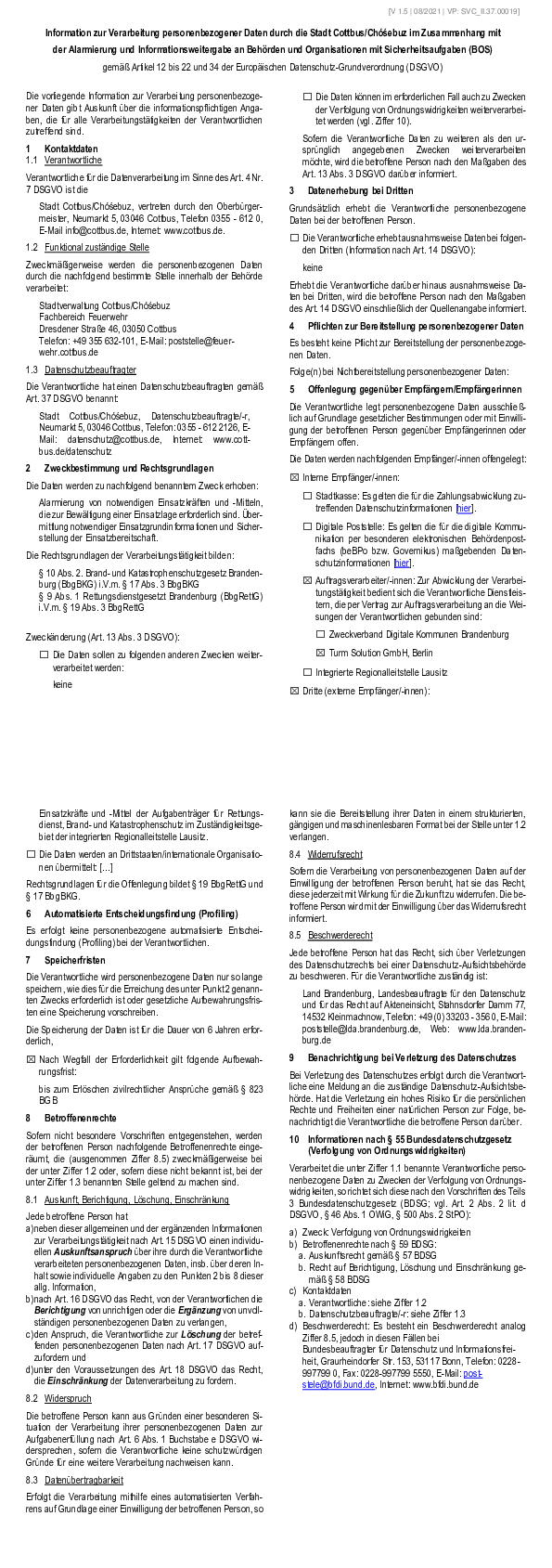 Information zur Verarbeitung personenbezogener Daten durch die Stadt Cottbus/Chóśebuz im Zusammenhang mit der Alarmierung und Informationsweitergabe an Behörden und Organisationen mit Sicherheitsaufgaben (BOS) gemäß Artikel 12 bis 22 und 34 der Europäischen Datenschutz-Grundverordnung (DSGVO)