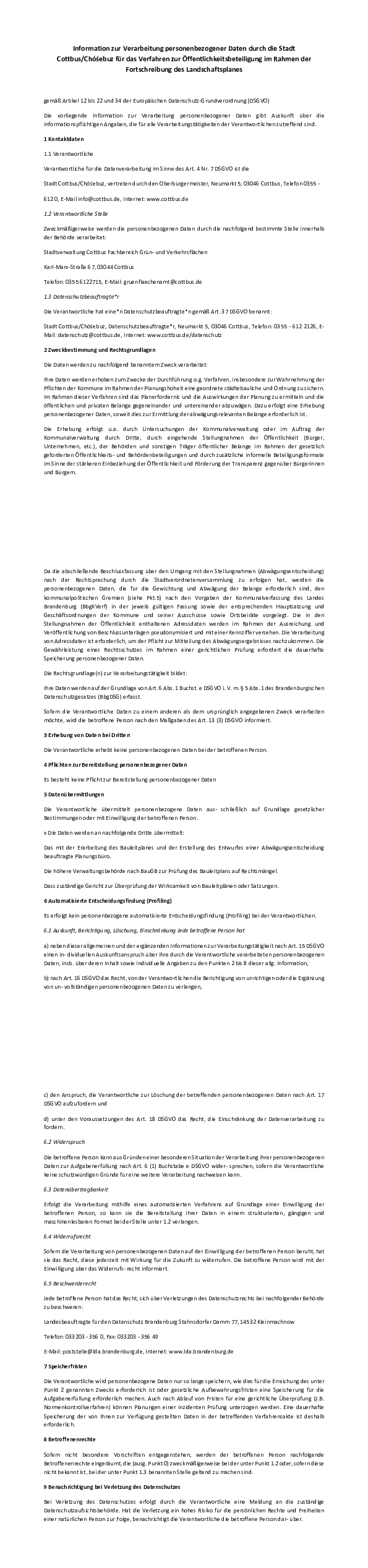 Information zur Verarbeitung personenbezogener Daten durch die Stadt Cottbus Chósebuz für das Verfahren zur Öffentlichkeitsbeteiligung im Rahmen der Fortschreibung des Landschaftsplanes