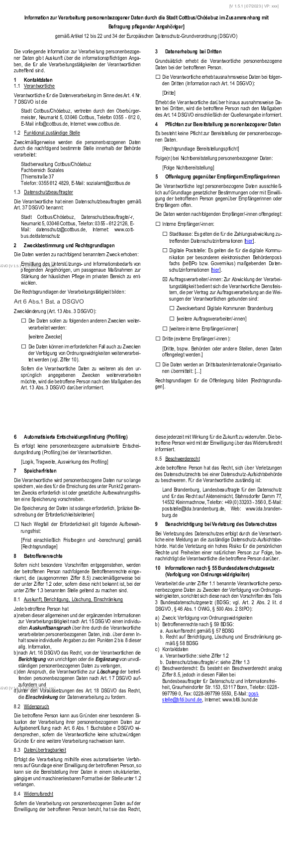 Information zur Verarbeitung personenbezogener Daten durch die Stadt Cottbus/Chóśebuz im Zusammenhang mit
