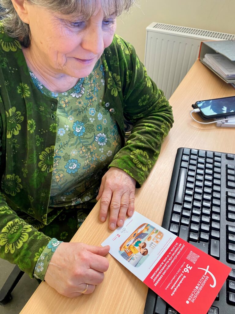 Dr. Norman Franzke hat Flyer der Frauenwochen an Frau Swensson übergeben, damit diese in ihrer Einrichtung an Interessierte verteilt werden können.