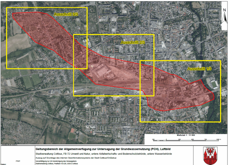 Allgemeinverfügung zum Verbot der Benutzung des Grundwassers innerhalb des gekennzeichneten Gebietes in der Stadt Cottbus/Chóśebuz