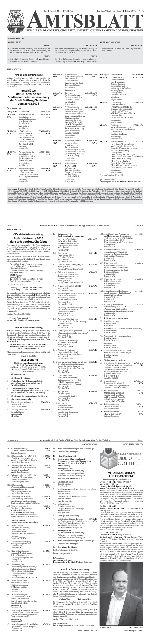 - Amtliche Bekanntmachung der Beschlüsse der 18. Sitzung der Stadtverordnetenversammlung der Stadt Cottbus/Chóśebuz vom 25.02.2026