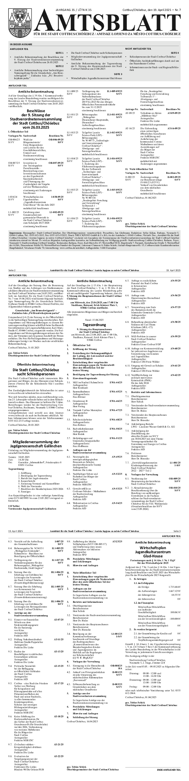 • Amtliche Bekanntmachung der Beschlüsse der 9. Sitzung der Stadtverordnetenversammlung der Stadt Cottbus/Chóśebuz vom 26.03.2025