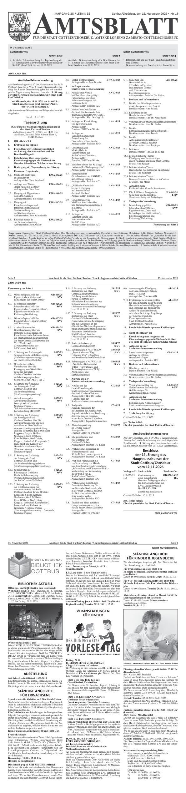 - Amtliche Bekanntmachung der Tagesordnung der 15. Sitzung der Stadtverordnetenversammlung der Stadt Cottbus/Chu00f3u015bebuz am 19.11.2025