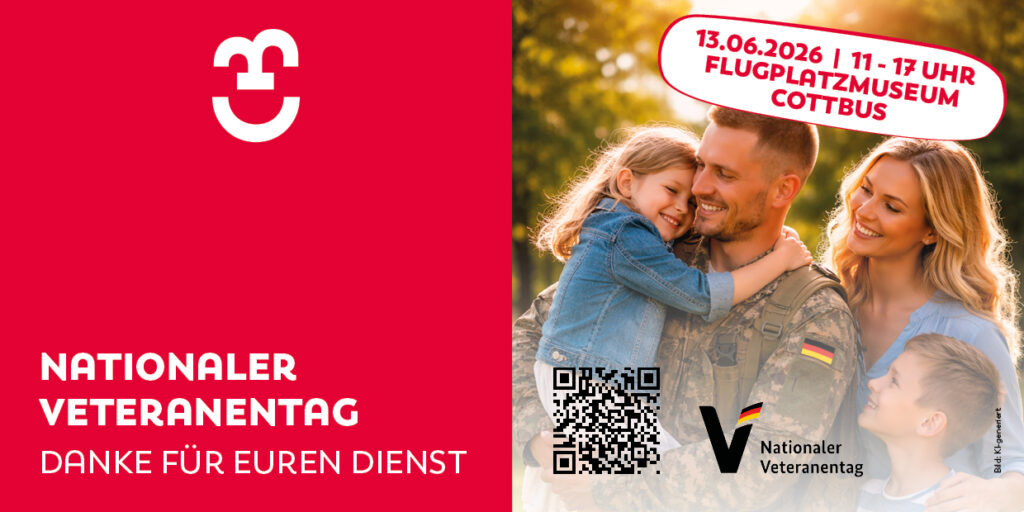 Die Veteraninnen und Veteranen aus der Stadt Cottbus/Chóśebuz sowie aus benachbarten Landkreisen stehen am 13.06.2026 im Mittelpunkt einer Würdigung. Anlässlich des vom Bundestag ins Leben gerufenen „Veteranentag“ treffen sich aktive und ehemalige Soldatinnen und Soldaten, Reservistinnen und Reservisten, Gesunde und Versehrte der Bundeswehr sowie deren Freunde und Familien auf dem Gelände des Flugplatzmuseums.
