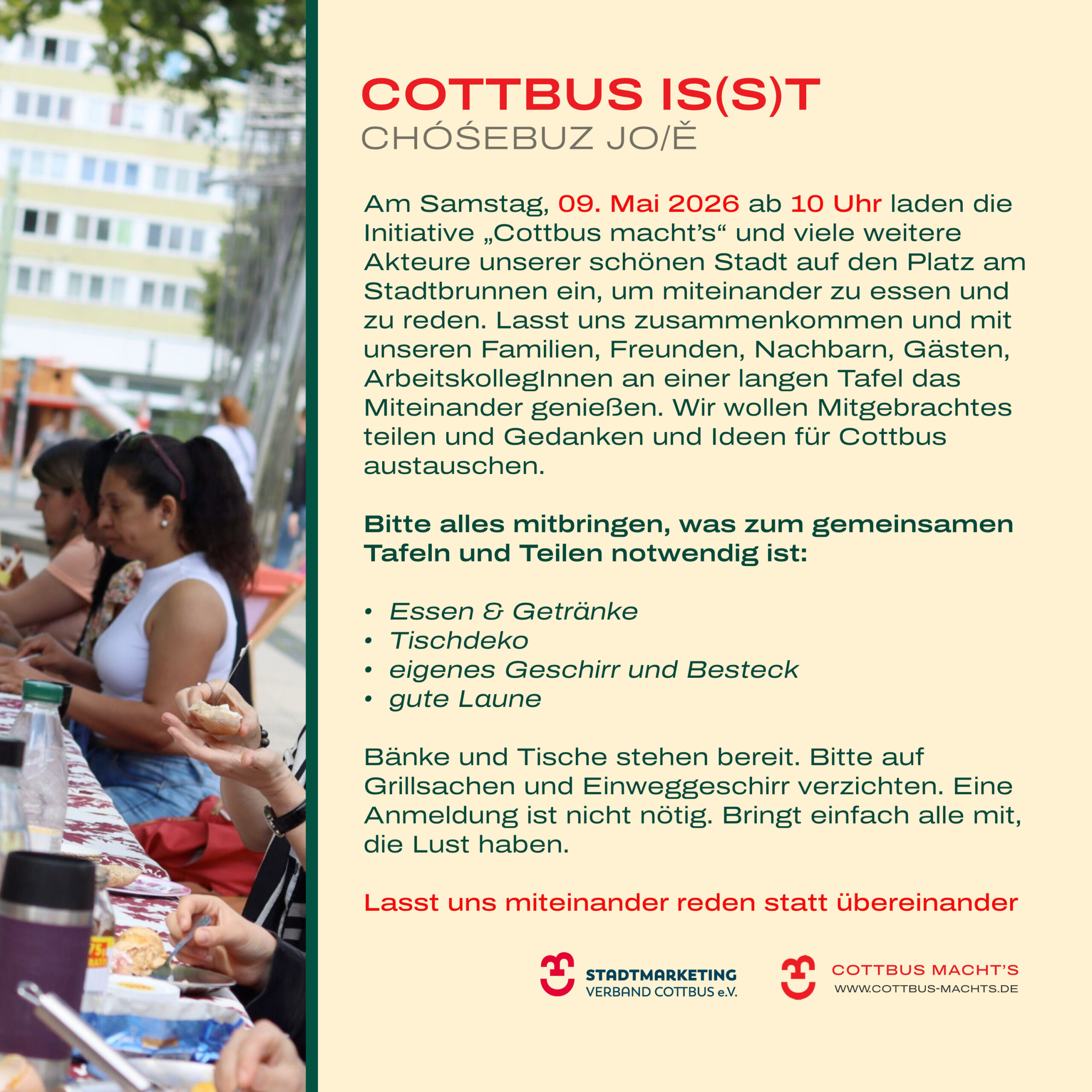 - Was: Cottbus is(s)t – gemeinsames Essen an einer langen Tafel