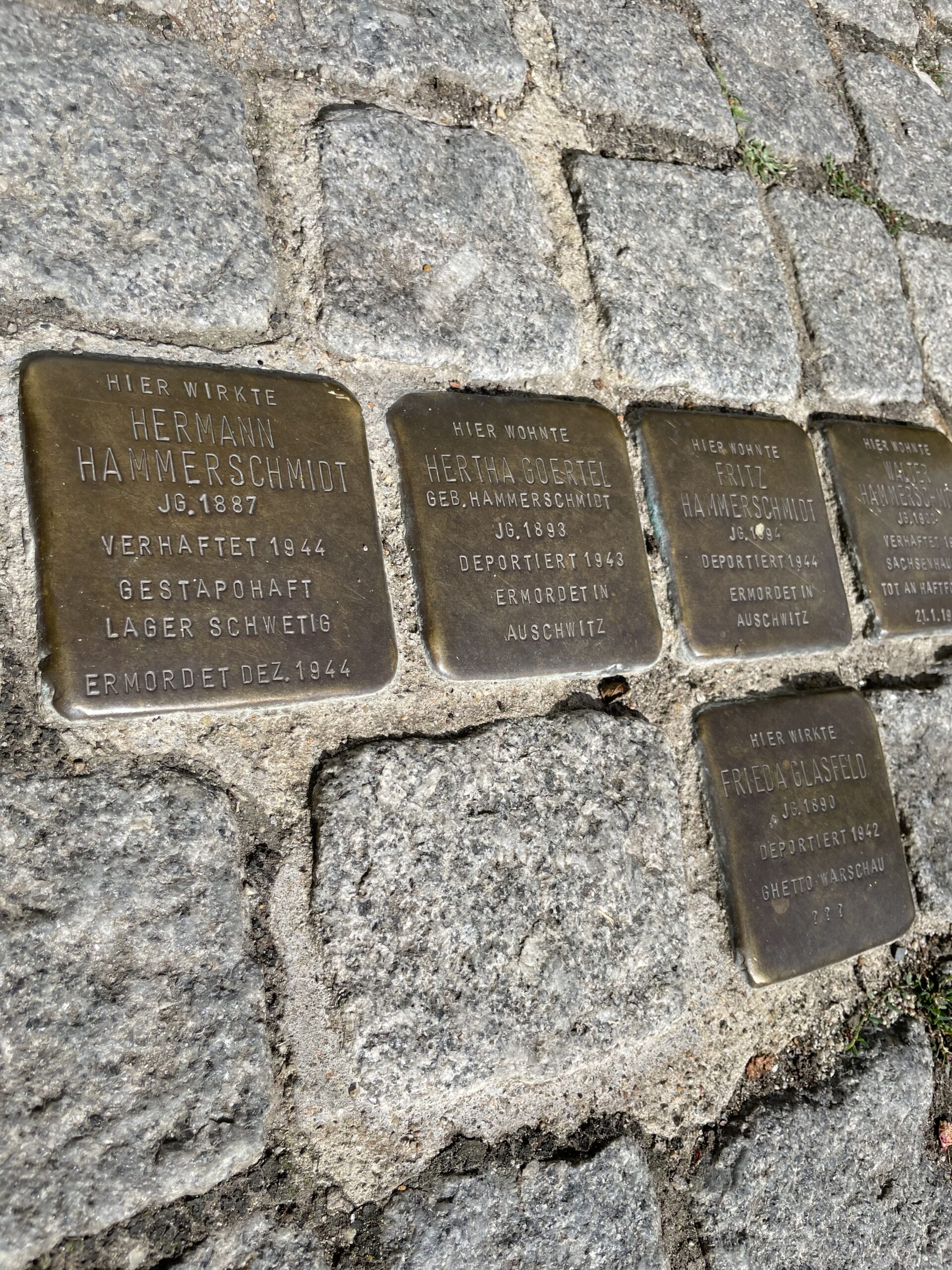 Die Stolpersteine sind eine Kunst-Aktion des Kölners Gunter Demnig. Mit ihnen wird an die während der Nazizeit verhafteten, deportierten und ermordeten Menschen erinnert. Die Stolpersteine werden vor dem letzten freiwilligen Wohnort der Opfer verlegt. Vorbeigehende sollen mit den Augen über die 10 x 10 cm großen Messingtafeln „stolpern“.