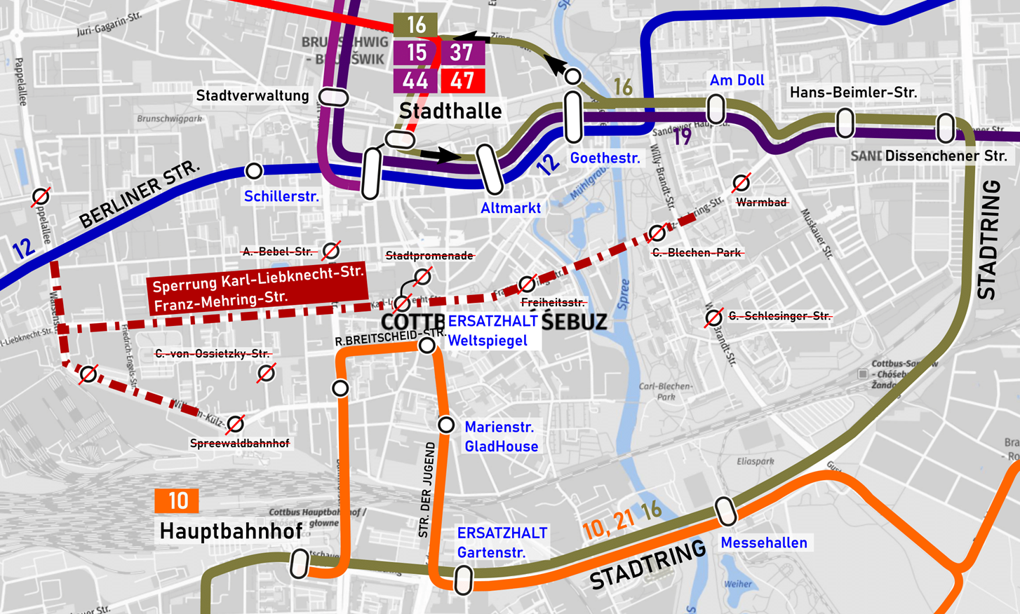 Die Straßenbahnlinien 1, 2, 3 und 4 verkehren von circa 13:15 Uhr bis 16:45 Uhr auf geänderten Linien. Die Linie 1 fährt von Schmellwitz Anger über die Stadthalle nach Ströbitz. Die Linie 2 fährt von Sandow am Rathaus vorbei nach Neu Schmellwitz. Die Linie 3 verkehrt von Madlow über den Hauptbahnhof zur Jessener Straße. Und die Linie 4 fährt von Sachsendorf über den Hauptbahnhof bis zur Wendeschleife Herman-Löns-Straße.