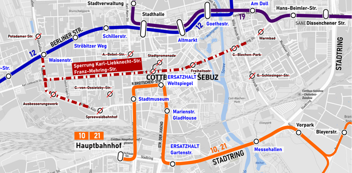 Durch die Sperrung der Karl-Liebknecht-Straße, der Franz-Mehring-Straße und der Bahnhofstraße kommt es zu einer Vollsperrung des Nord-Süd-Verkehrs. Die einzige Verbindung wird über die Buslinie 16 via Stadtring hergestellt.