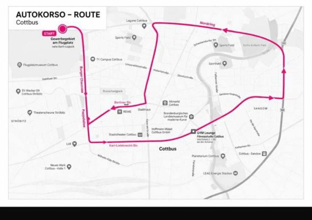 Der Autokorso wird voraussichtlich ab 15:30 Uhr den folgenden Verlauf nehmen: