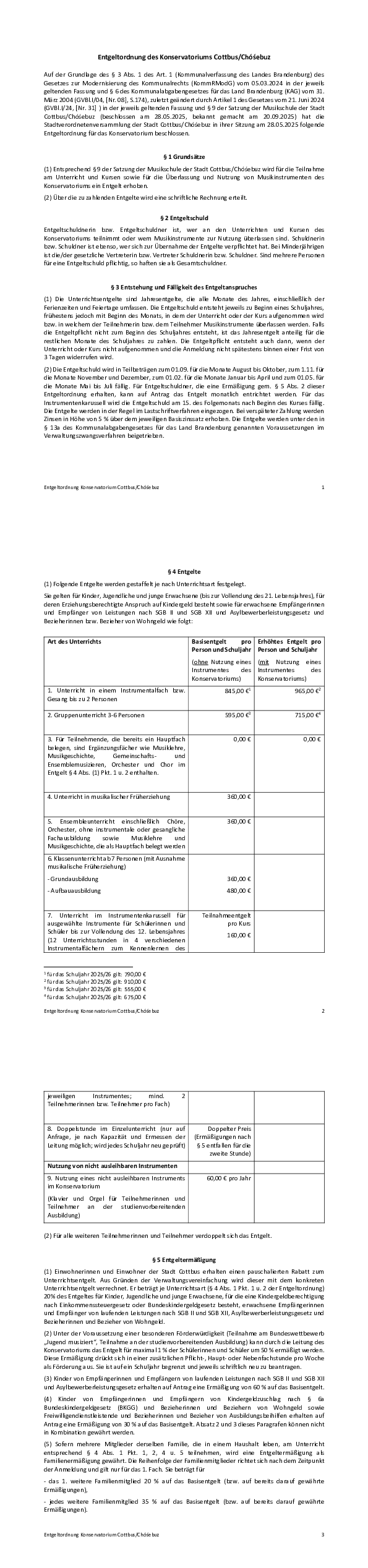 Entgeltordnung des Konservatoriums Cottbus-Chóśebuz vom 20.09.2025