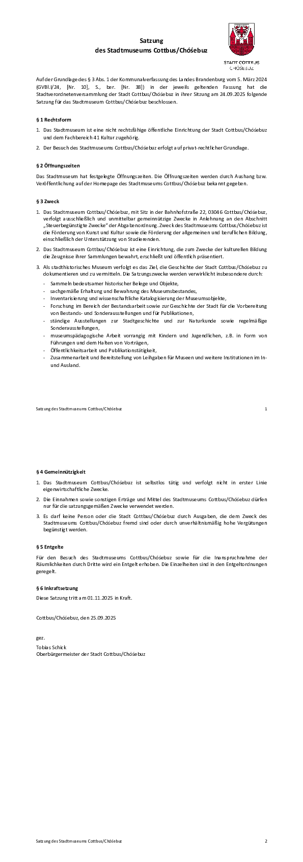 Neufassung der Satzung des Stadtmuseums Cottbus