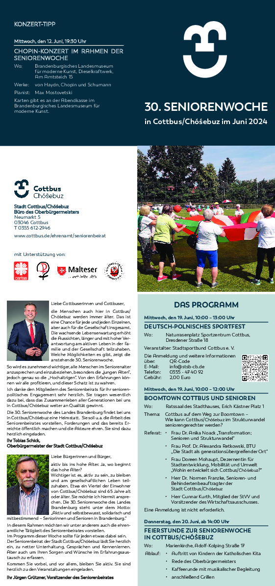 so lautete das Motto der 30. Brandenburgischen Seniorenwoche, die am 15. Juni 2024 mit der brandenburgweiten Eröffnungsveranstaltung in Fürstenwalde/Spree startete. Auch in Cottbus/Chóśebuz wurde ein buntes Programm in der Aktionswoche zusammengestellt. Wichtige Veranstaltungen waren z.B. das deutsch-polnische Seniorensportfest im Sportzentrum, eine Podiumsdiskussion im Stadthaus und die Festveranstaltung im Pfarrgarten der St. Mariengemeinde.